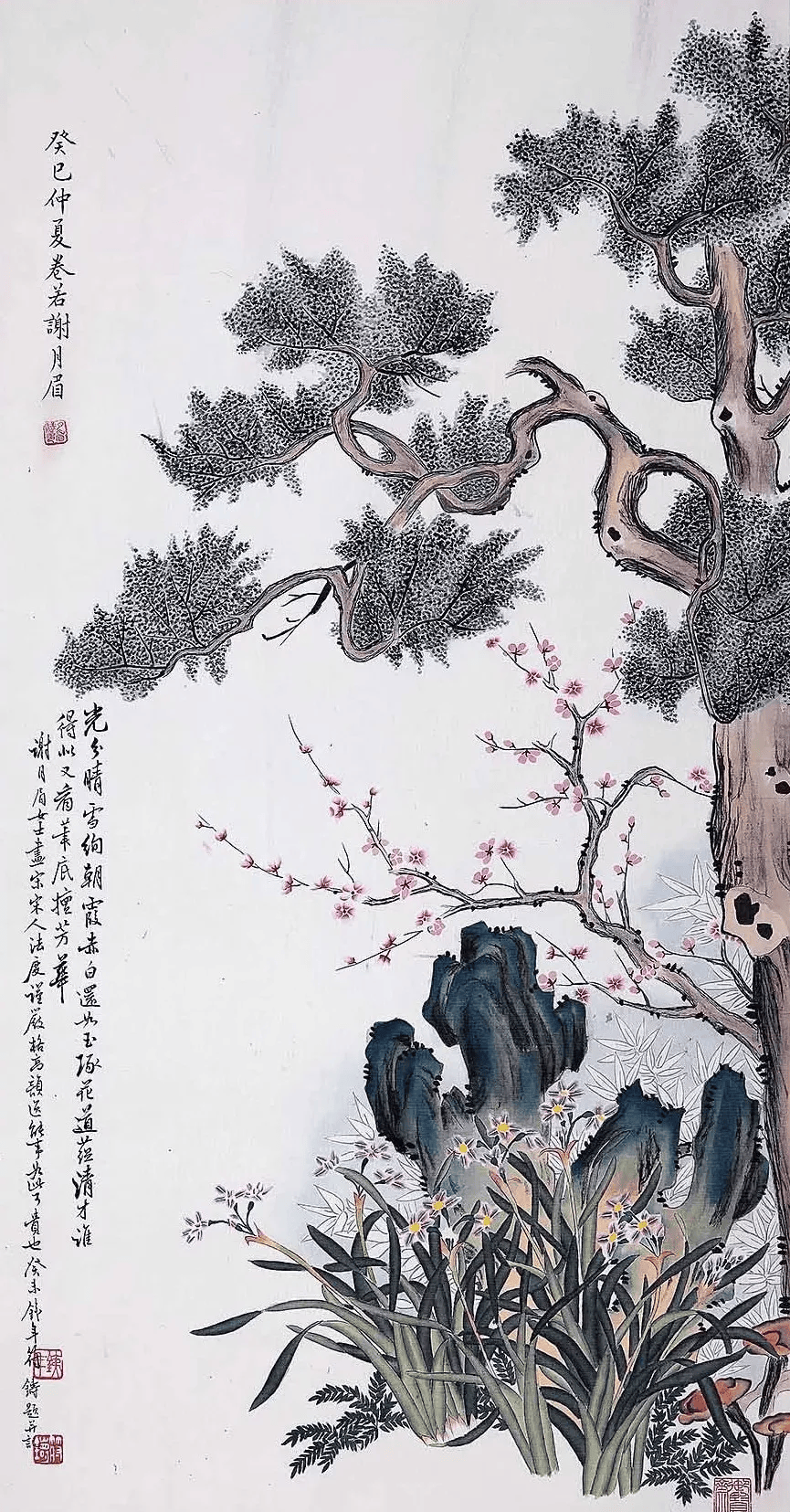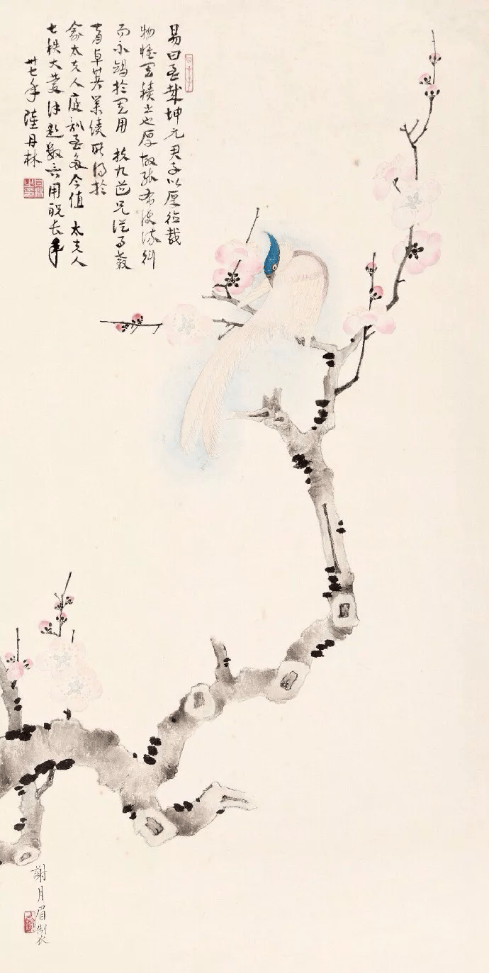 大哥谢玉岑在《题月眉工笔花鸟(四首)》中有句:“谁将画派溯南田?真谛惟应静里传。佛土花寒参识慧,仙禽语妙验清圆。”“风雅故家零落尽,对君新稿一欣然。”另在《题月眉画红梅大千补竹石》中有句云:“聪明弟妹耽诗画,能事吾应愧篆书。”