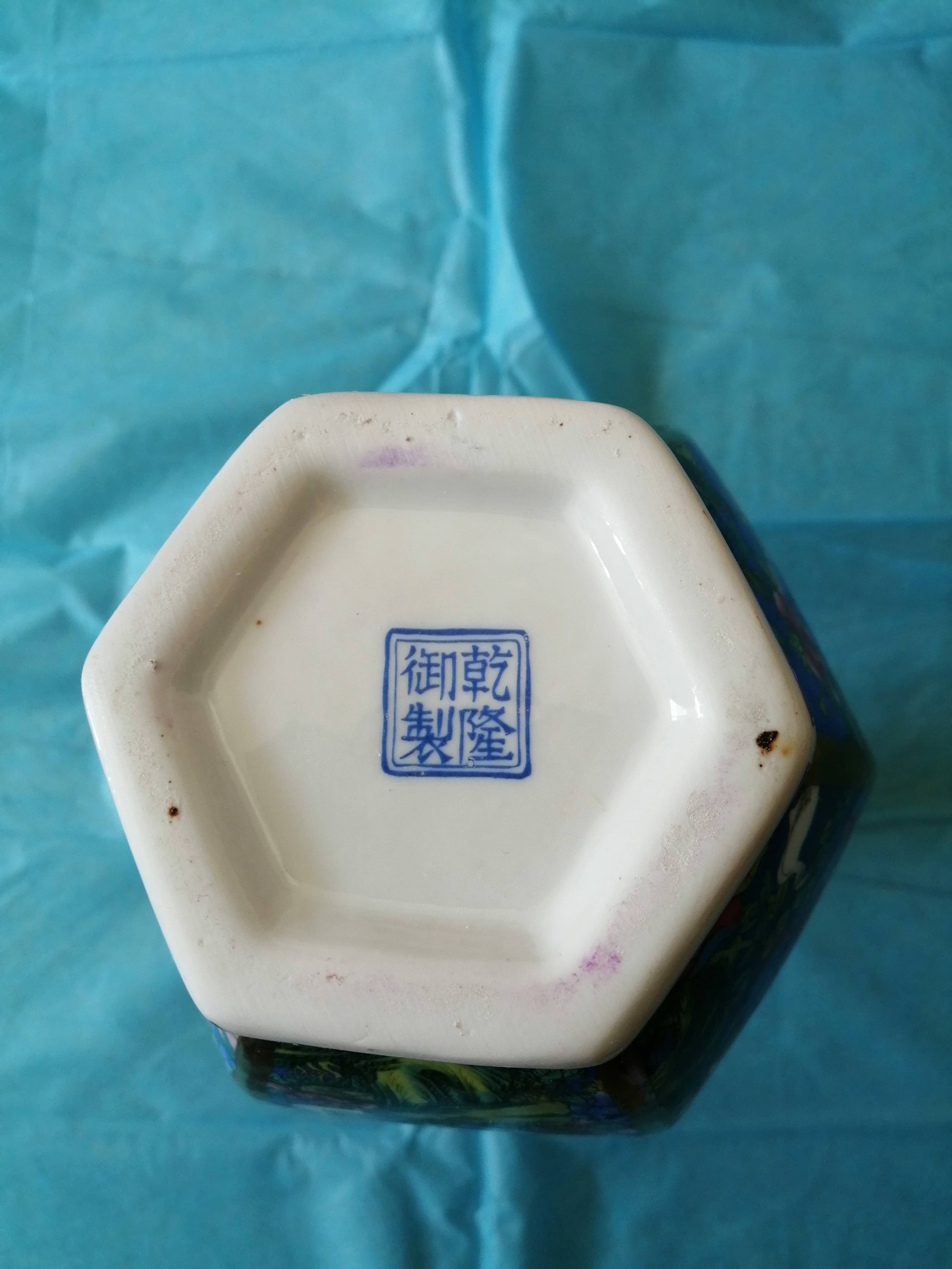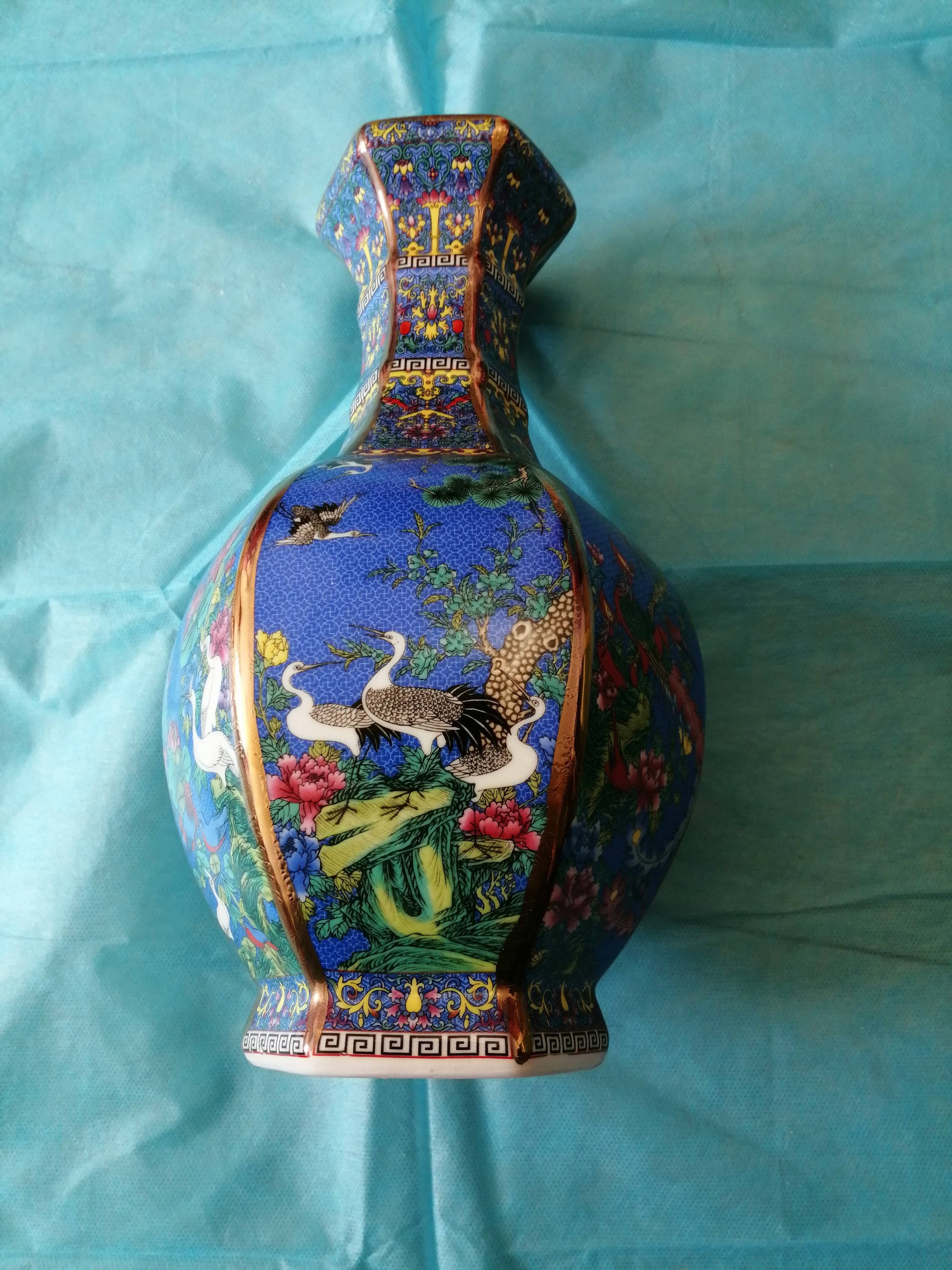 从造型上看,珐琅彩描金松鹤延年赏瓶通常具有优美的线条,多为六棱形,瓶身修长,颈部略细,腹部圆润,底部平稳,整体造型端庄典雅。在色彩方面,珐琅彩的运用使得赏瓶色彩绚丽多彩,蓝色的背景与松鹤、花卉等图案的色彩相互映衬,鲜艳夺目又不失和谐。描金工艺的加入,更是增添了华贵之感,金色线条在光线照射下熠熠生辉,与珐琅彩的色彩交相辉映,极具视觉冲击力。