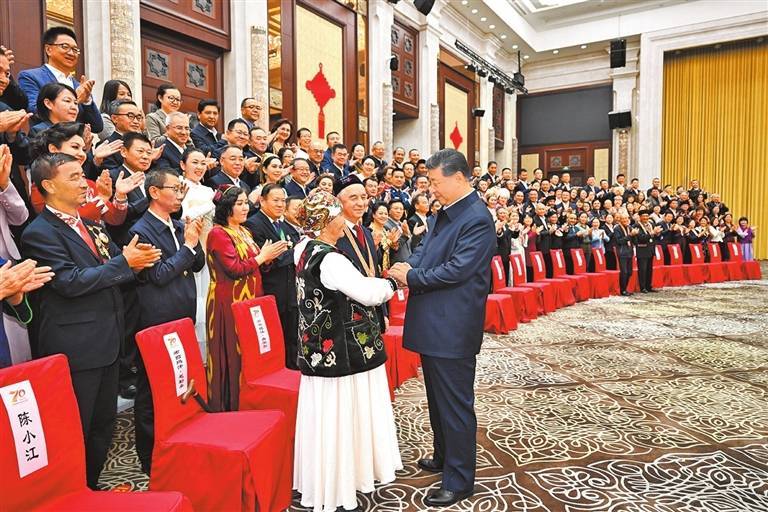 9月23日下午,中共中央总书记、国家主席、中央军委主席习近平在乌鲁木齐亲切接见新疆各族各界代表。这是习近平同代表亲切交流。新华社记者 谢环驰 摄
