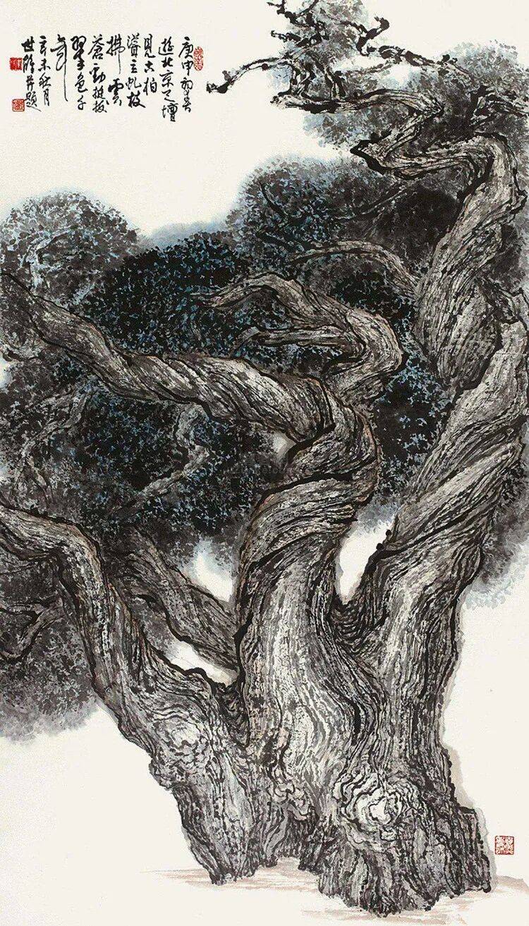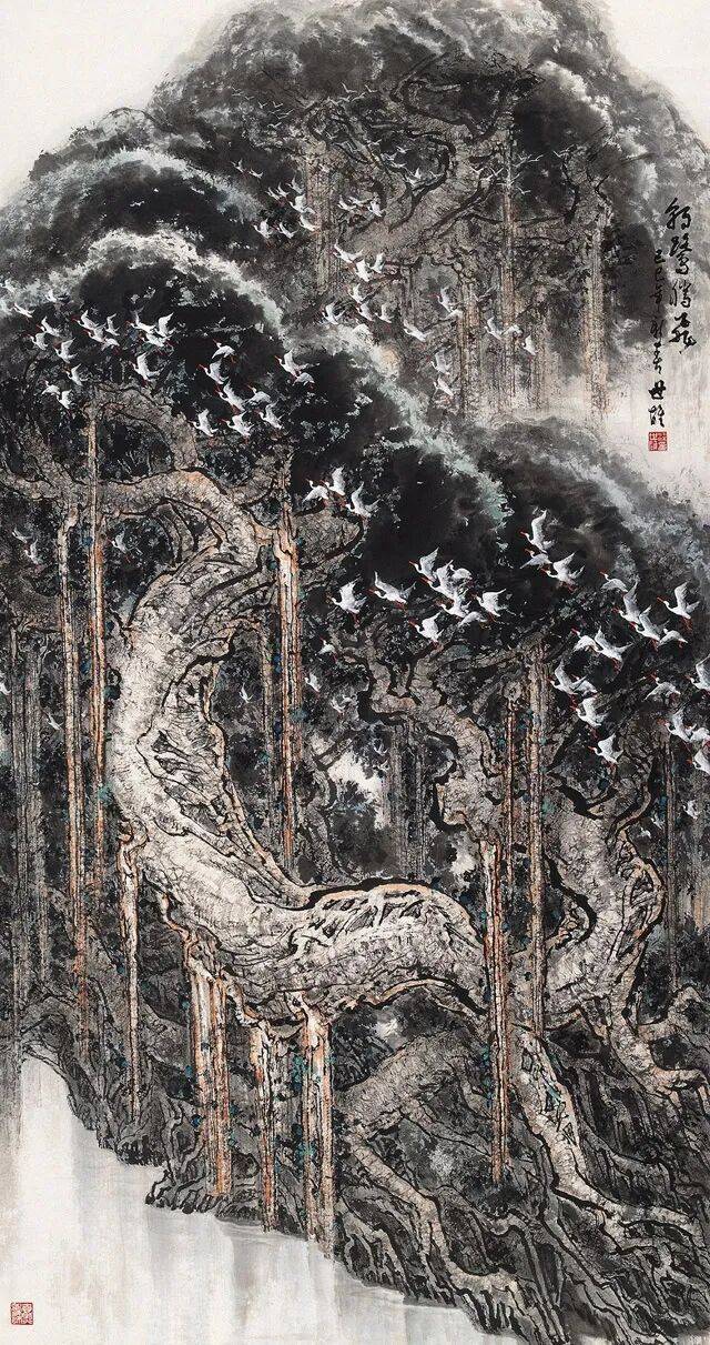 这种“兼收南北”的笔墨风格,并非简单的技法叠加,而是他对中国画笔墨语言的创造性转化——他打破了南北方画法的壁垒,将北方山水的雄健构图与岭南画派的笔墨韵味相融合,同时积极探索前辈未及的题材与表现手法,认真分辨不同地域景物的特质,让每一幅作品都拥有独特的视觉辨识度。例如他笔下的胡杨,以粗壮的枝干与厚重的墨色表现其“生而不死一千年,死而不倒一千年,倒而不朽一千年”的坚韧品格,既没有刻意模仿北方画家的雄浑,也没有固守岭南画派的纤巧,而是以个性化的笔墨赋予胡杨以精神内涵,成为其艺术风格的典型代表。
