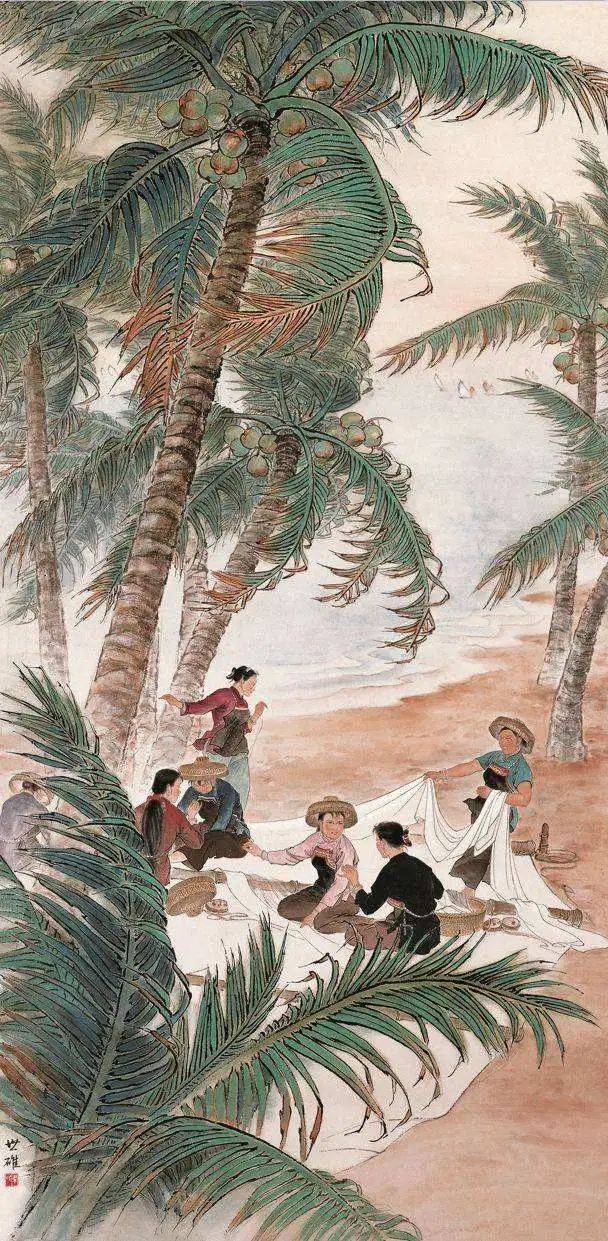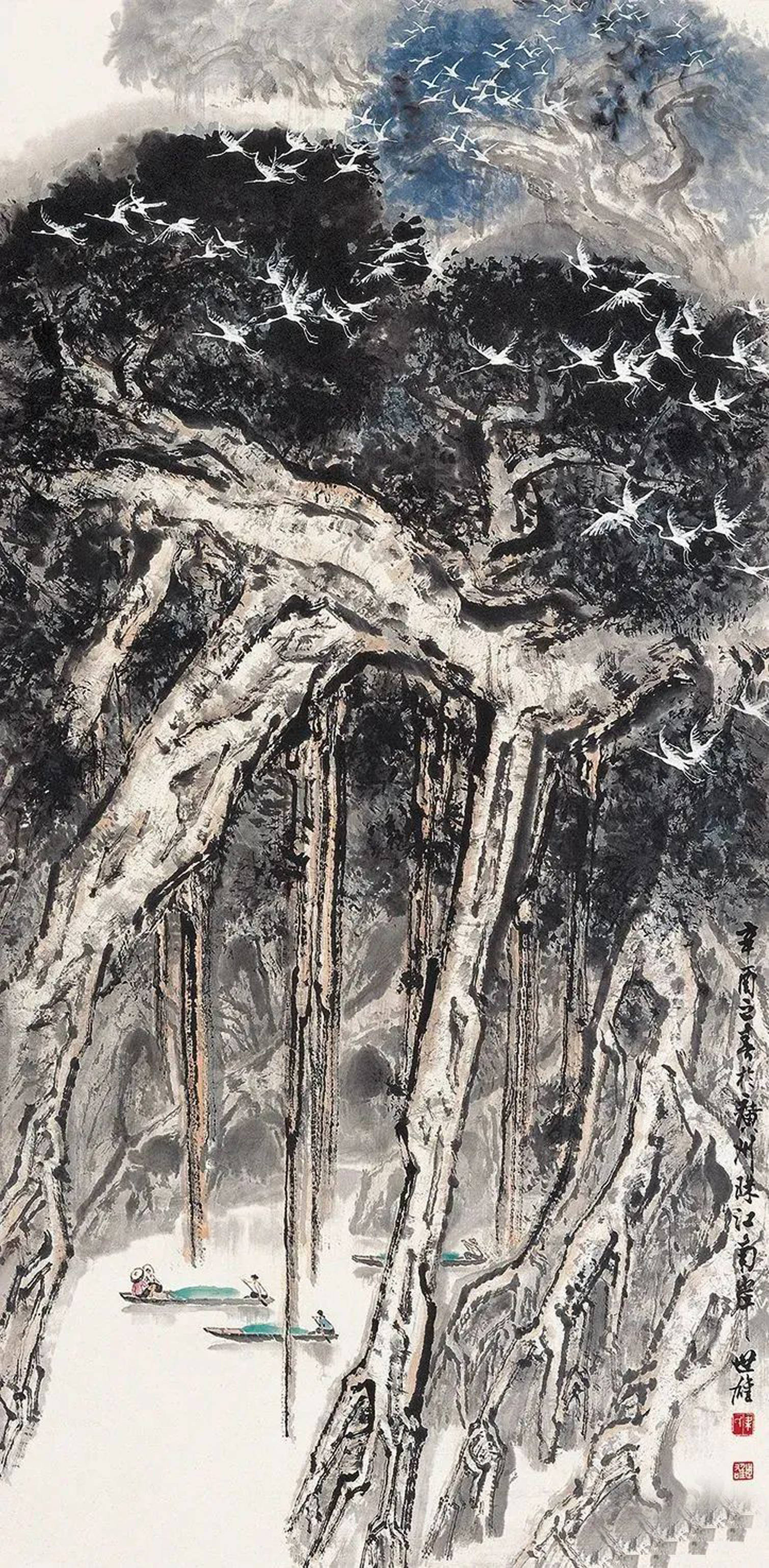 ”上世纪七十年代以前,梁世雄主要从事现代人物画创作,作品聚焦现实生活中的普通人,以准确的物象造型与严密的构图,反映新中国建设时期的社会风貌,体现出强烈的时代责任感;此后,他全面转向山水画创作,却并未脱离现实,而是以山水画为载体,表现祖国山河的壮美与时代的变迁——他笔下的雪山不再是传统山水画中远离人间的“仙境”,而是充满生命活力的高原景象;他画的巨榕不再是文人画中孤高的象征,而是承载着南方百姓生活记忆的“生命之树”。这种“以山水写时代”的创作路径,既突破了传统山水画的题材局限,又赋予了山水画新的时代内涵,为中国画的现代性转型提供了极具价值的实践方案。