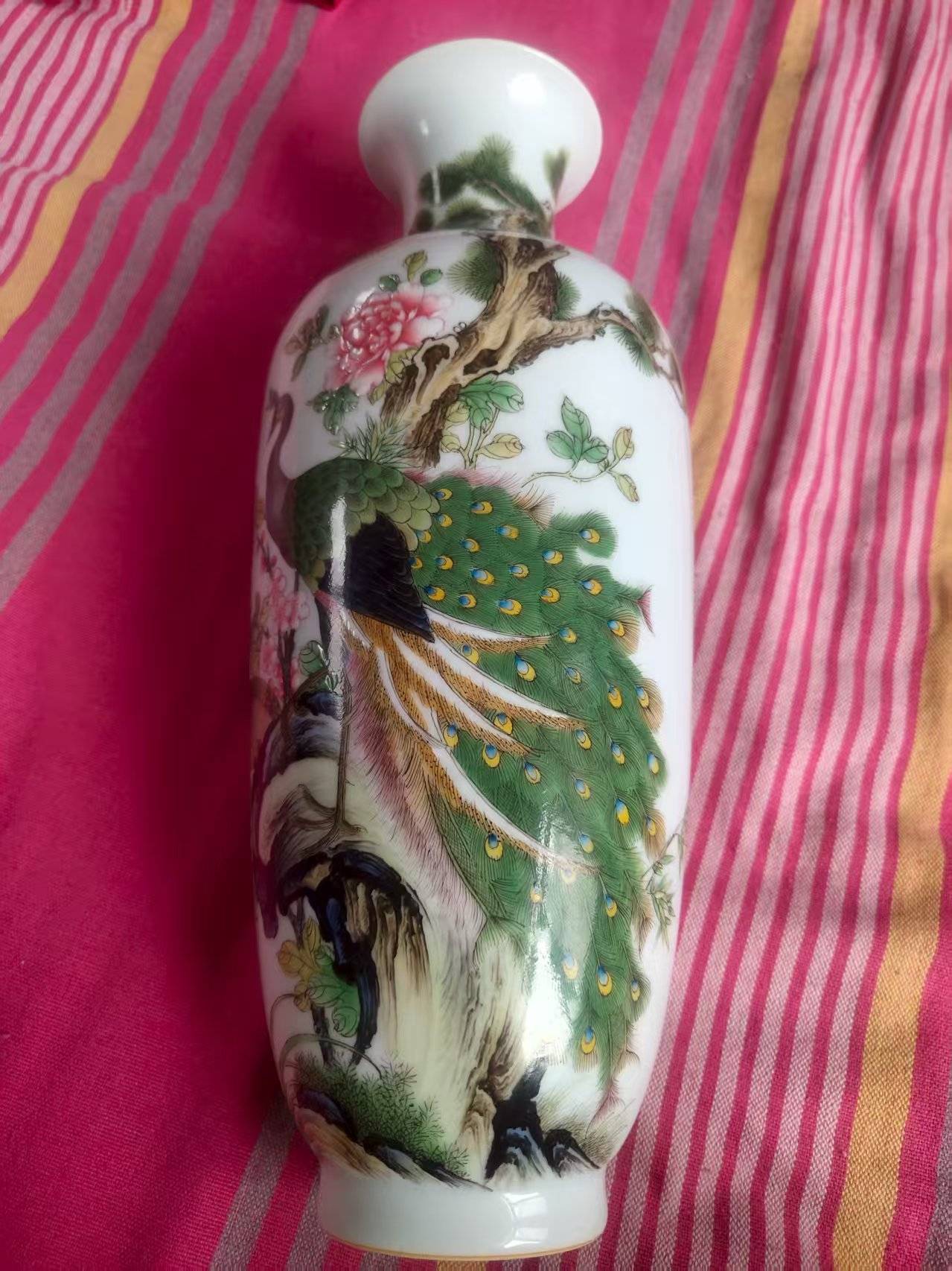 在构图上,牡丹与孔雀的位置安排恰到好处,疏密得当,既突出了主体,又使整个画面显得和谐统一。背景的松树、山石等元素的点缀,不仅丰富了画面内容,还营造出一种自然、生动的氛围,使整个画面具有很强的立体感和空间感,仿佛将一幅精美的花鸟画立体地呈现在瓷器之上。