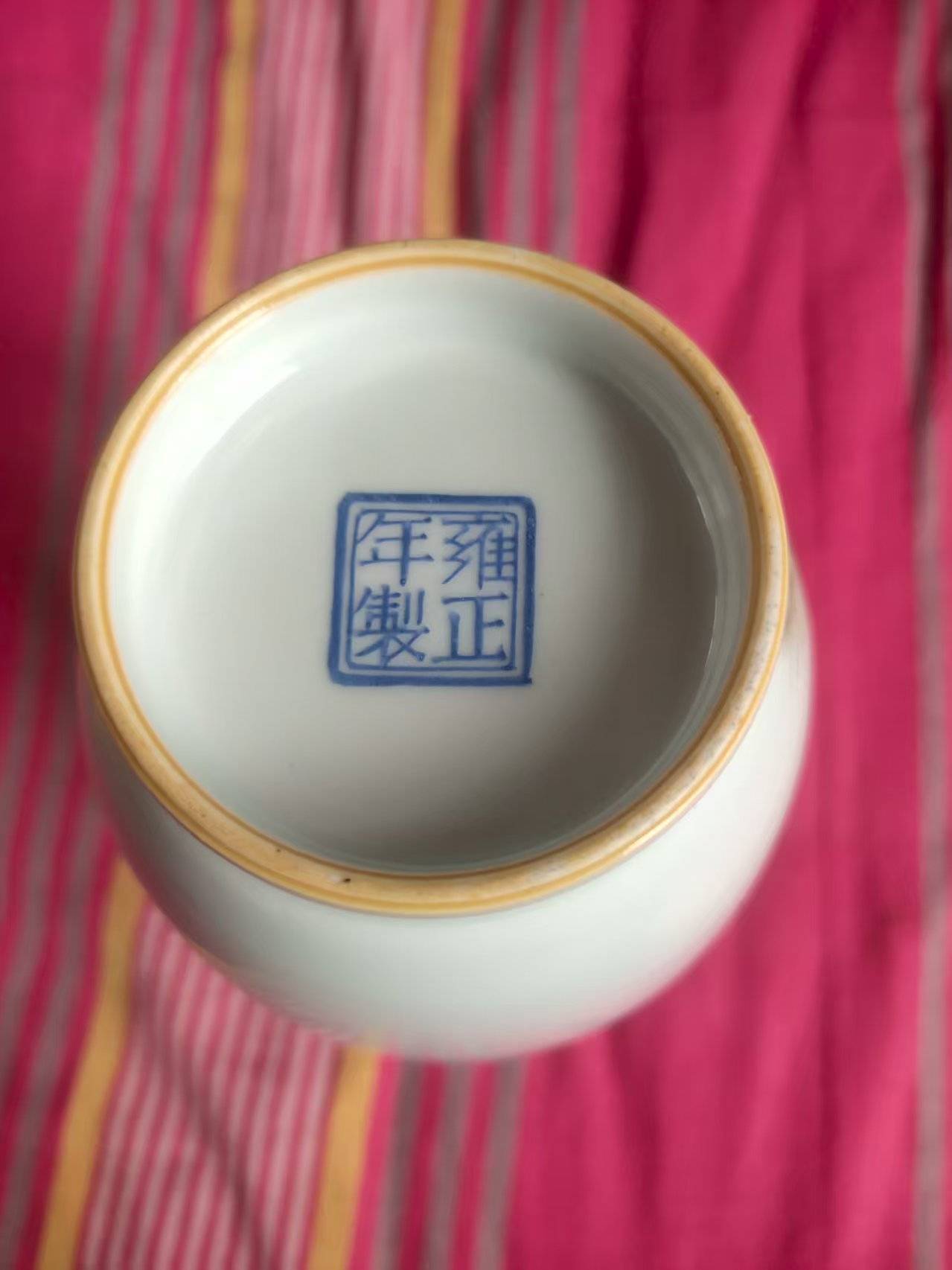 瓶底的“雍正年制”款识,是这只珐琅彩牡丹孔雀瓶身份的重要标识。雍正时期的款识书写规范、严谨,字体工整秀丽,一般为青花或蓝料彩书写的四字楷书款。“雍正年制”款识不仅是对瓷器制作年代的记录,更是宫廷御窑厂制作工艺和品质的保证。通过款识的字体、写法、用料等细节,专家们可以对瓷器的真伪和年代进行鉴别,它也成为了研究雍正时期瓷器的重要依据之一。