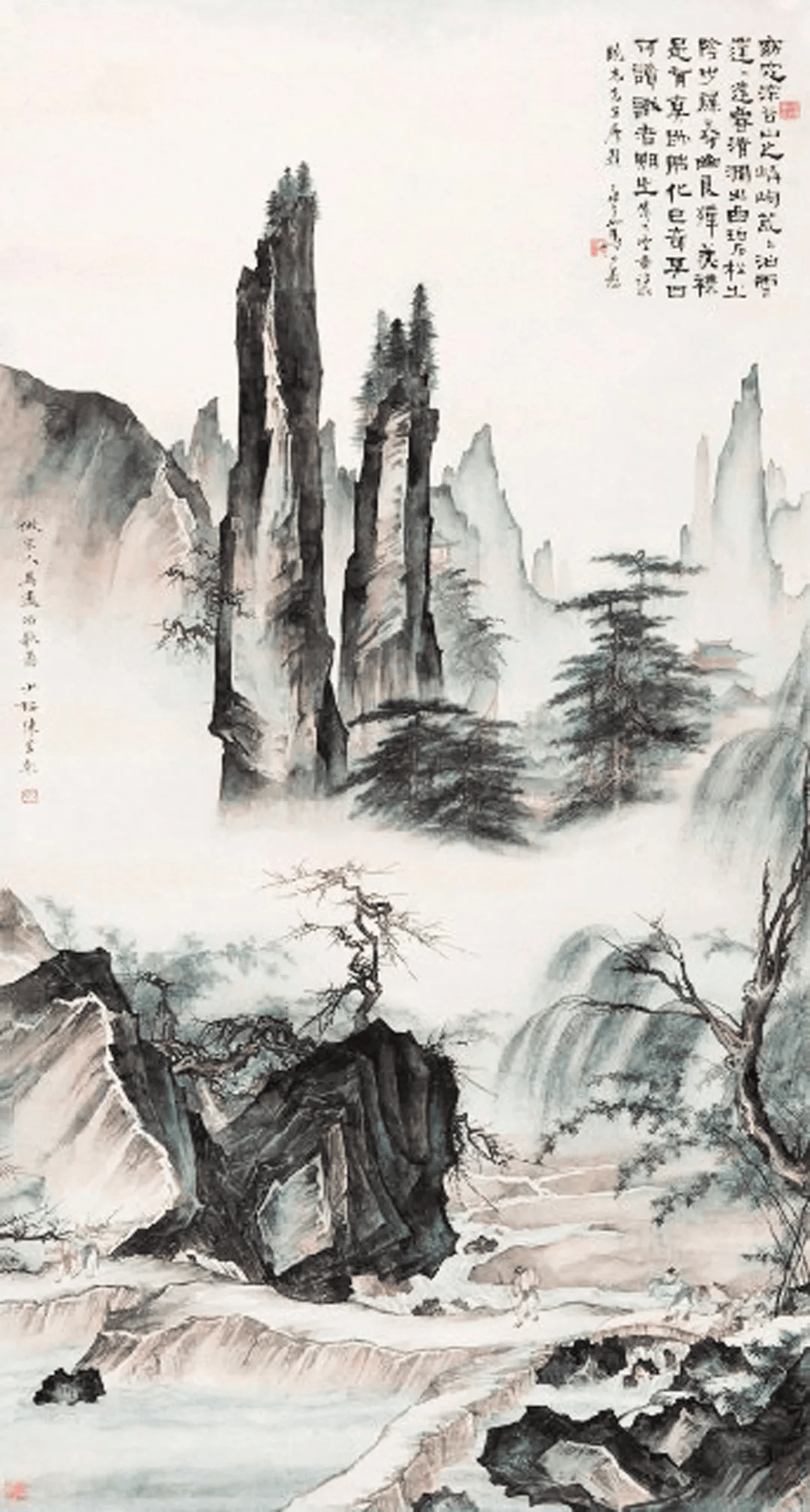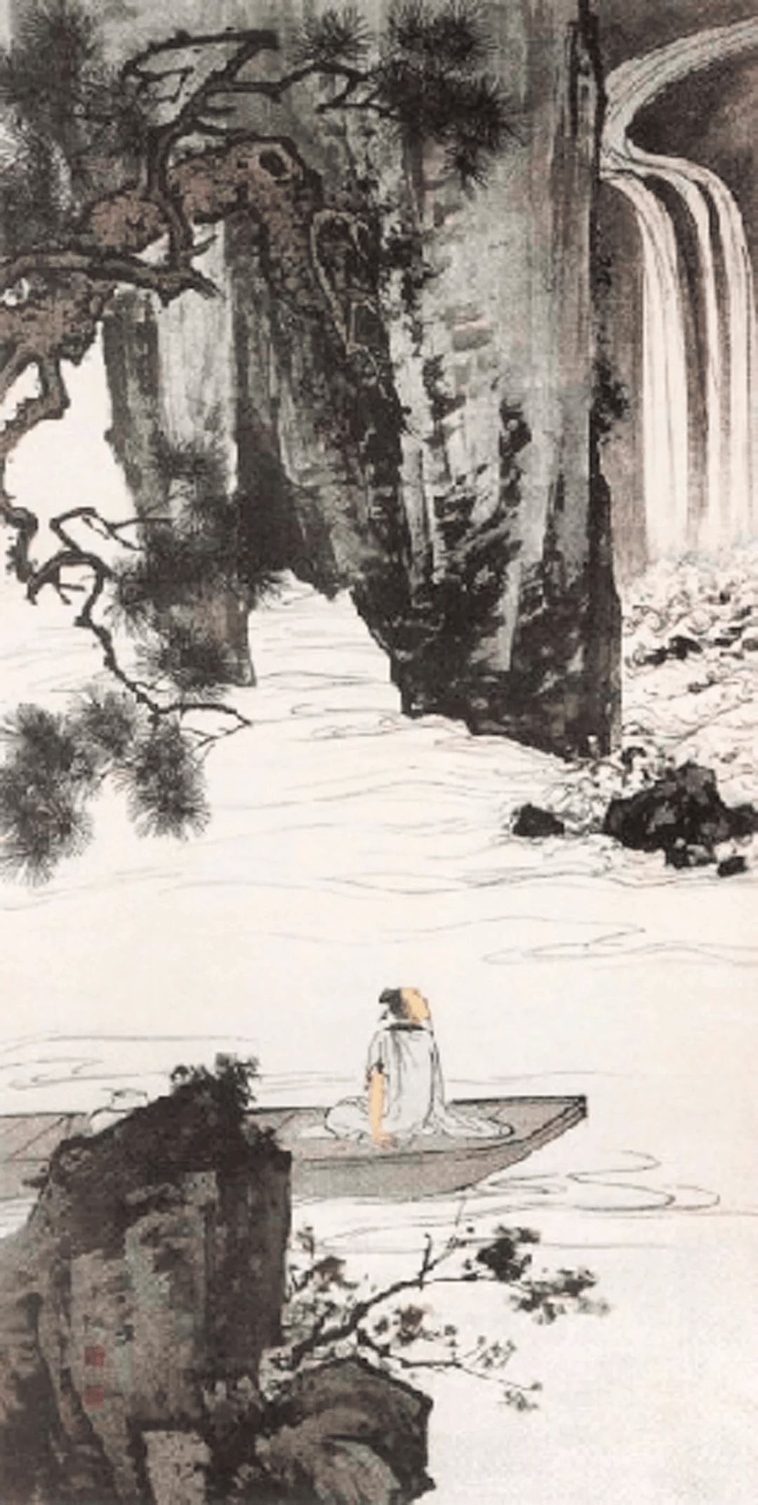荣宝斋收藏了一幅陈少梅纸本设色《太白观瀑图》,应该是绝对的真品。我们可以在网上搜一搜,看一看有多少幅署名陈少梅的相同和相似的作品,通过比照就可立辨真伪。不论巨石的勾皴,松树的枝干和松叶的勾染,还是人物衣纹和水纹的勾描,都可以看出陈少梅的传统绘画技法常人很难学到精髓。