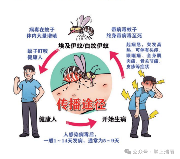 当雌性伊蚊叮咬感染者后,病毒随血液进入蚊子体内,经过8~10天(称为外潜伏期)的增殖后获得感染力,当它再次叮咬人时,即将病毒传给另一个人。