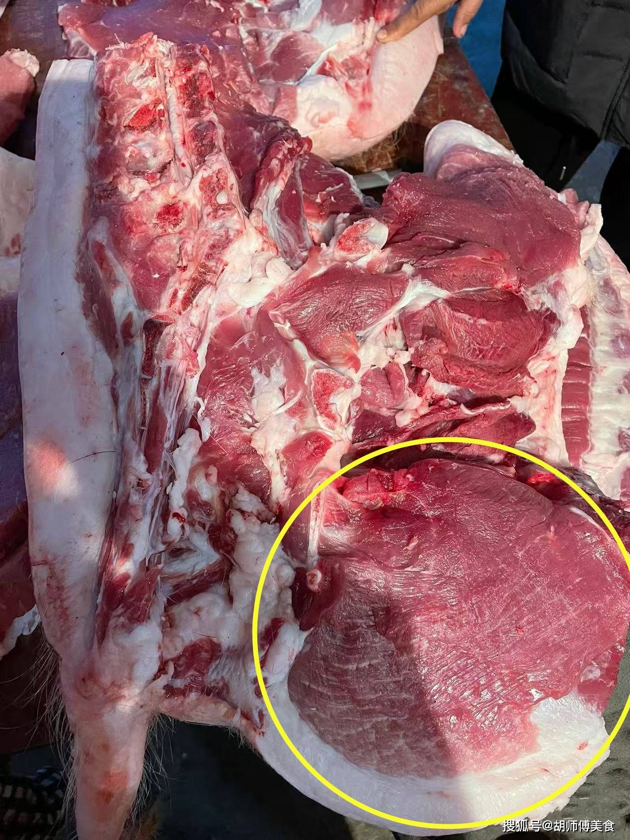元宝肉”,是位于后腿棒子骨砂锅,靠近屁股尖的一块球形肉,因为这个球特别像元宝,所以在民间就把这个部位称为“元宝肉”,也有一些地方把这块肉称为“弹子肉”、“拳头肉”。因为元宝肉靠近猪臀,所以这个地方是经常运动的,这就使得这个部位的瘦肉吃着特别鲜嫩,比如我们在做汆肉或者炒肉时,首选元宝肉,这样能使做出来的肉吃着超级嫩。而元宝肉也是猪身上偏贵的肉,它比五花肉要贵1-2元1斤,买回家的元宝肉,一定要及时吃完,过夜后,味道都会差一点。