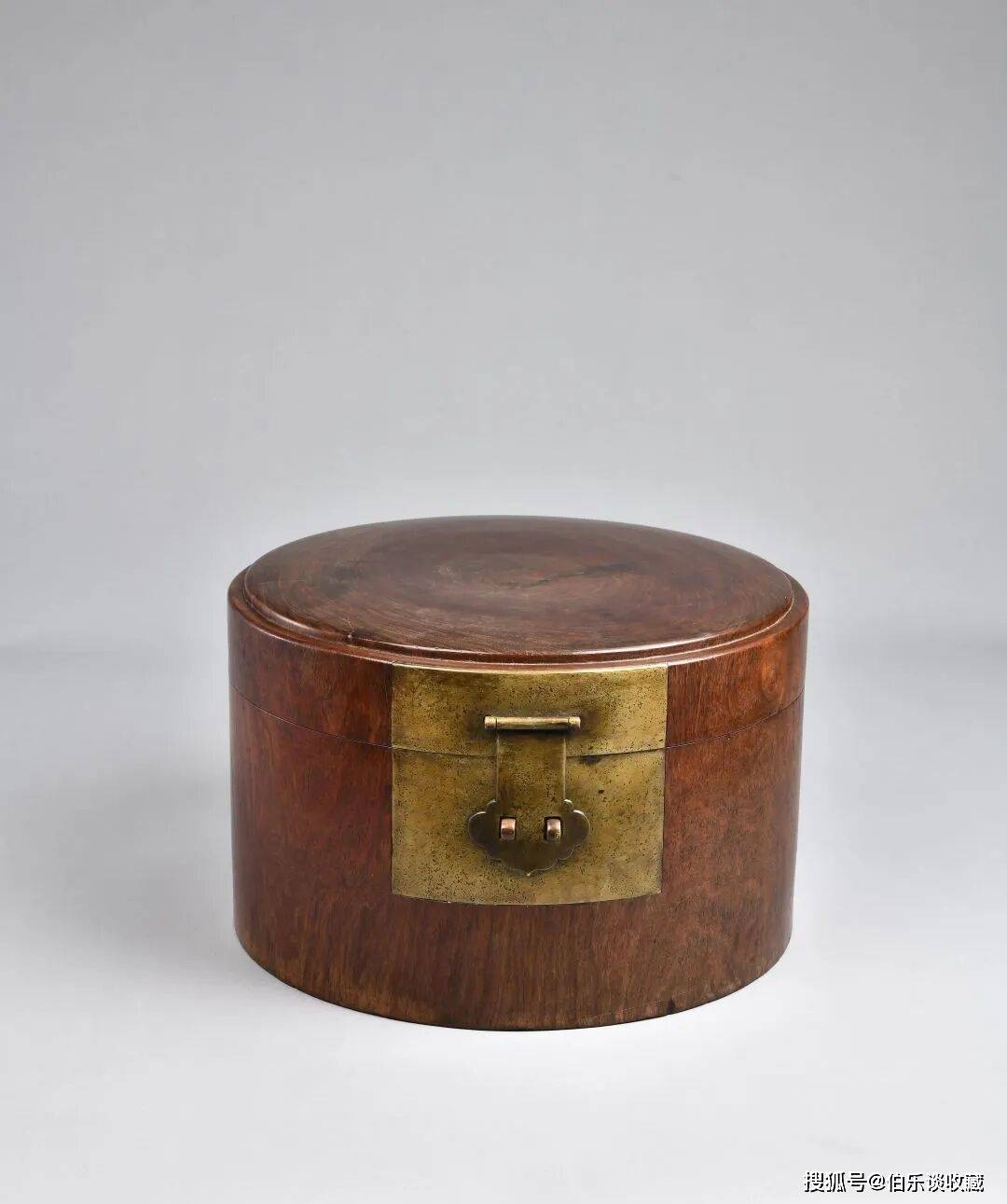 此筒状圆盒尺寸硕大,以粗大的黄花梨树干掏挖旋制,用料奢华,木质年轮细腻如画,如同波纹般向外涟漪。顶面微微弧凸,中心微凹,形成微妙的曲面,既增造型之变化,又消解木材内部应力的作用。属官宦之家特殊定制盒具,用来放置官帽等物。
