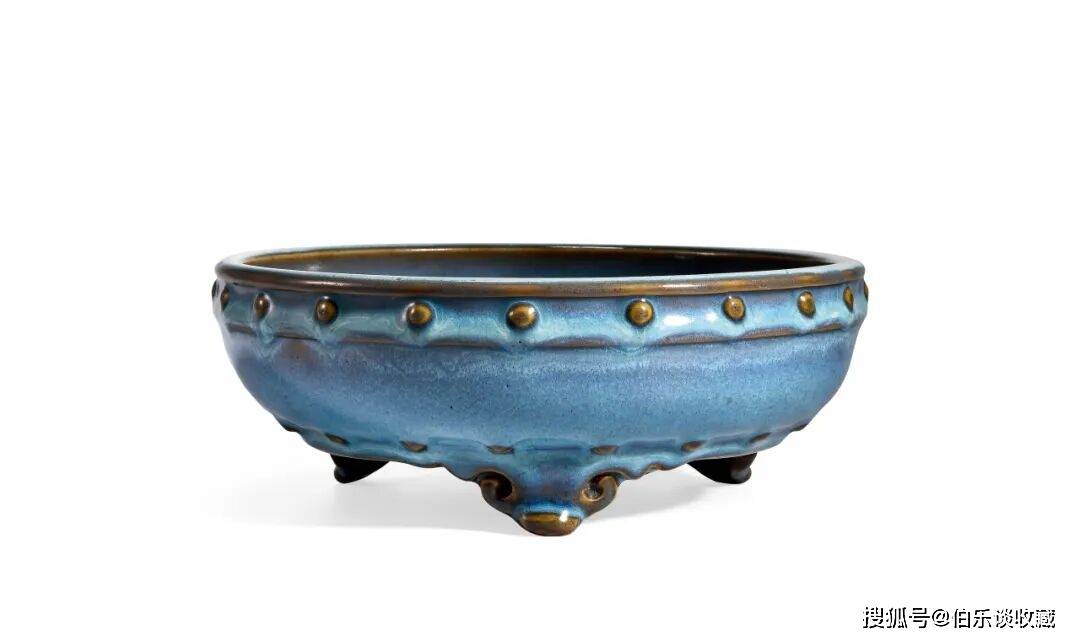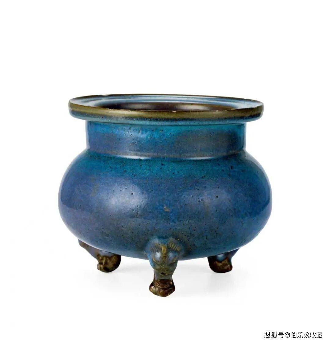 钧窑三足炉,尺寸硕大,发色浓丽,艳紫天蓝相互交融,柔美如幻,珍稀罕得。此类大型钧瓷,器身多见模造纹饰,釉色带斑,风格繁复。本品仅缀兽面于足顶,炉身素净,更显钧釉之华,简约秀丽,韵味悠长。 钧窑器之蓝釉紫斑引人入胜,乃中国制瓷史上一大创举,其瑰丽脱颖于宋瓷诸窑,独树一帜,而其天蓝釉色非颜料所致,乃视觉使然,釉层富含玻璃微粒,散射蓝光,正如天空蔚蓝之故。而蓝釉上所施色料,以铜发红,却难以掌控,故无法预知成器发色,因机缘偶,每器皆举世无双,纹理变幻浑然天成,平添钧瓷雅趣。本品为金代的钧窑之典范, 释质肥润若凝脂。窑变紫斑自然流潎,如晚霞化,青紫交融处宛若天成。足见金代的钧窑工匠对火侯与釉料掌握之高趣。