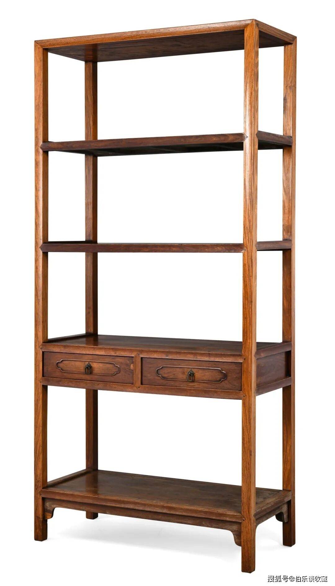此书架通体框架,四面空畅,层板皆镶上珍贵的金丝楠木,不但防虫蠹,既耐腐且性温软宜人,放置书册最为合适。下方设两具抽屉,浮雕海棠形开光,简练大方,明风浓郁,附铜菱花形垫片。下方四面设刀牙板,造型秀美,与整体造型相得益彰。明式家具中书架甚为少见,此例堪称明式书架典范,看似简练,实则处处用心,比例拿捏得宜,法度谨严,材美工良,又经重要著录,殊为难得。