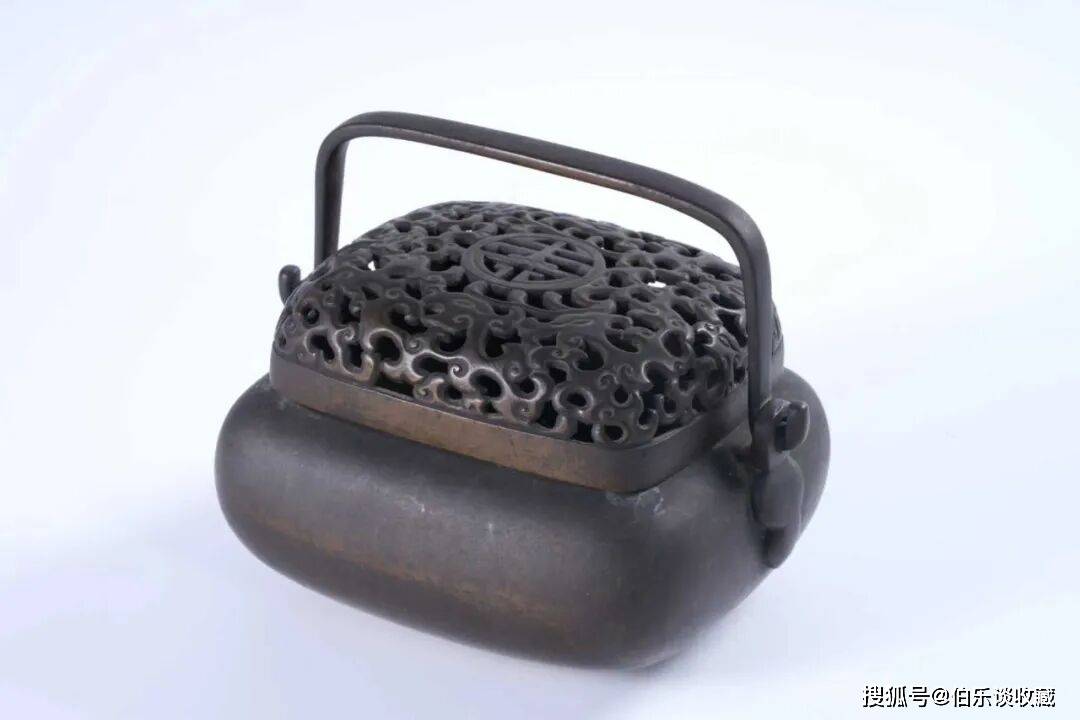 此长方体手炉,铜质优良,光泽柔和,稳重浑朴。盖顶錾刻镂空,有通透感,虚实相济。镂雕夔龙纹饰,中间为「寿」字的变形,呈夔龙捧寿之画面。炉身光素无纹,炉体虽较小,器型却大气简洁。炉底内铸《大清雍正年制》楷书款。