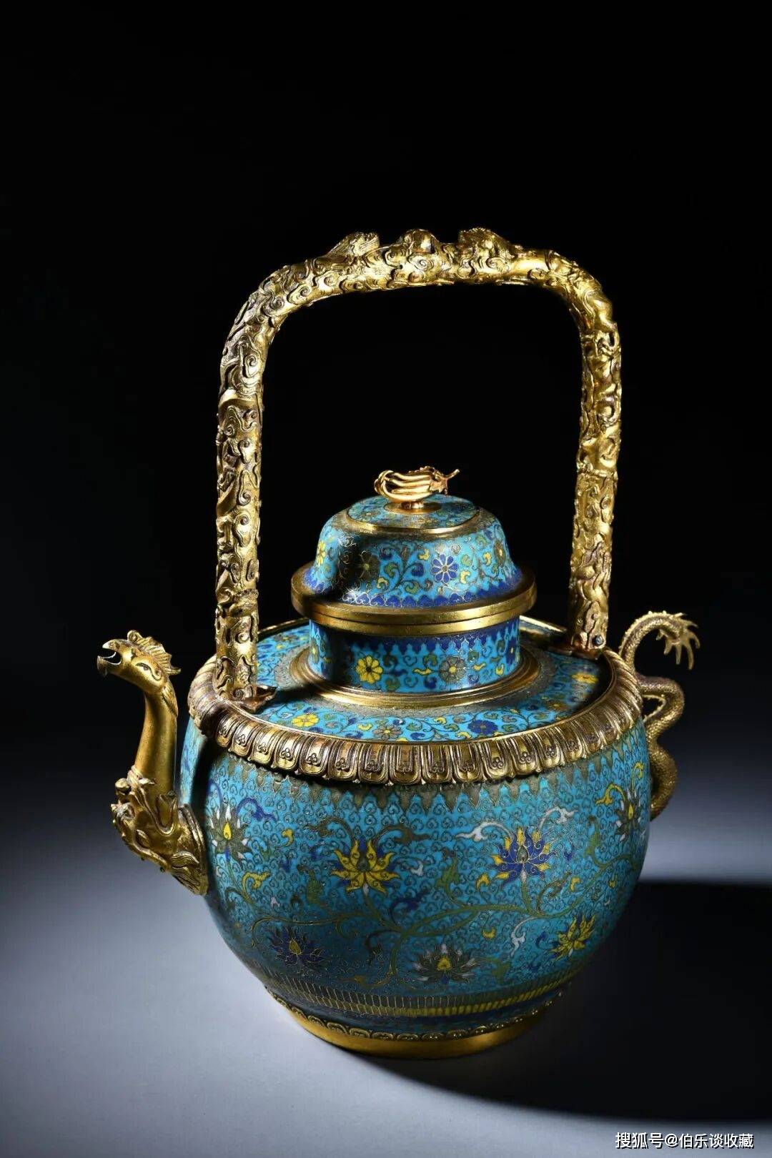 此把掐丝珐琅凤首提梁壶,整体造型模仿了商周时期的青铜提梁盉壶,配以铜胎掐丝珐琅的技法,呈现出华丽厚重的风貌。壶流呈凤首状,凤冠高耸,龙头口衔凤首,龙凤相映成趣。《清宫造办处活计档》最早关于铜胎珐琅提梁壶的记录,始于乾隆四年(1739年)八月九日。这把掐丝珐琅提梁壶,应当是乾隆七年八月或十二月应乾隆旨意烧造的掐丝珐琅提梁壶,布局和纹饰都模仿北京故宫收藏的明代掐丝提梁壶珐琅壶的纹饰和造型。此类掐丝珐琅提梁壶当时只烧造了一把和两对,据记载,一把和其中一对已收藏于博物馆,今次拍卖为另外一对,但当中一把下落不明,而今次呈献的掐丝珐琅凤首提梁壶为私人珍藏里仅存世的一把,十分珍稀。