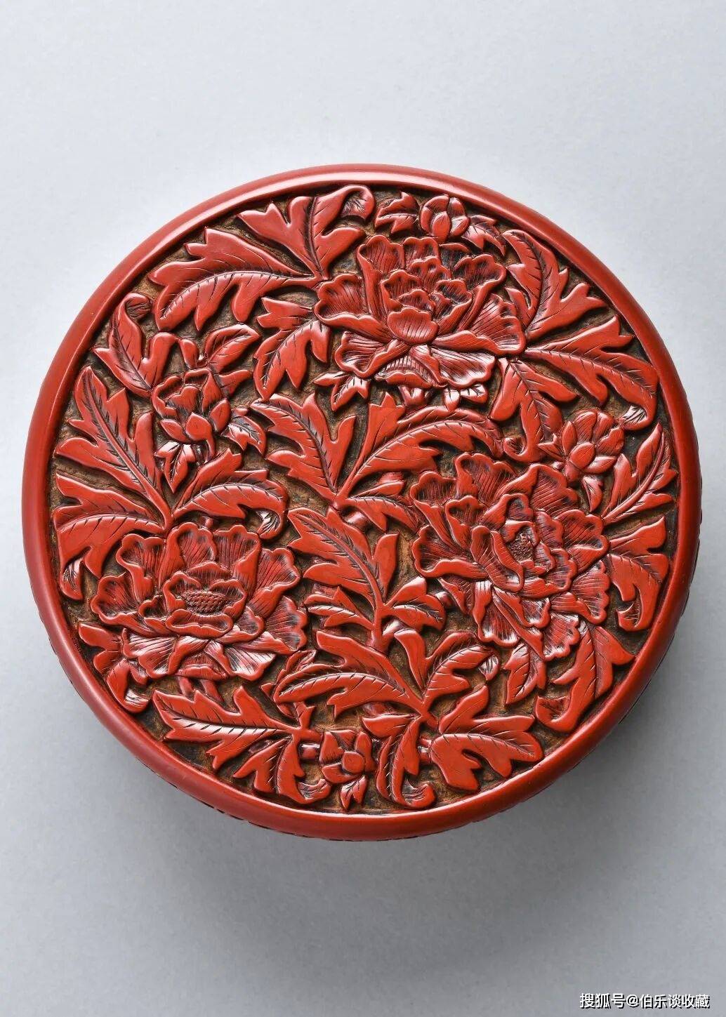 盒盖以三枝盛放的牡丹为主,生动优美。漆层厚重,花朵雕刻错落有致,花叶团簇,将牡丹怒放之姿展现得淋漓尽致。盒侧亦作牡丹,波浪状枝叶。底部髹黑漆,光可鉴人,近足处左右分别落《大明永乐年制》、《张成造》,针划细款。张成所制漆器髹漆厚重,故以「叶厚花肥,极富质感」而闻名,此盖盒亦可彰显其独特风格。