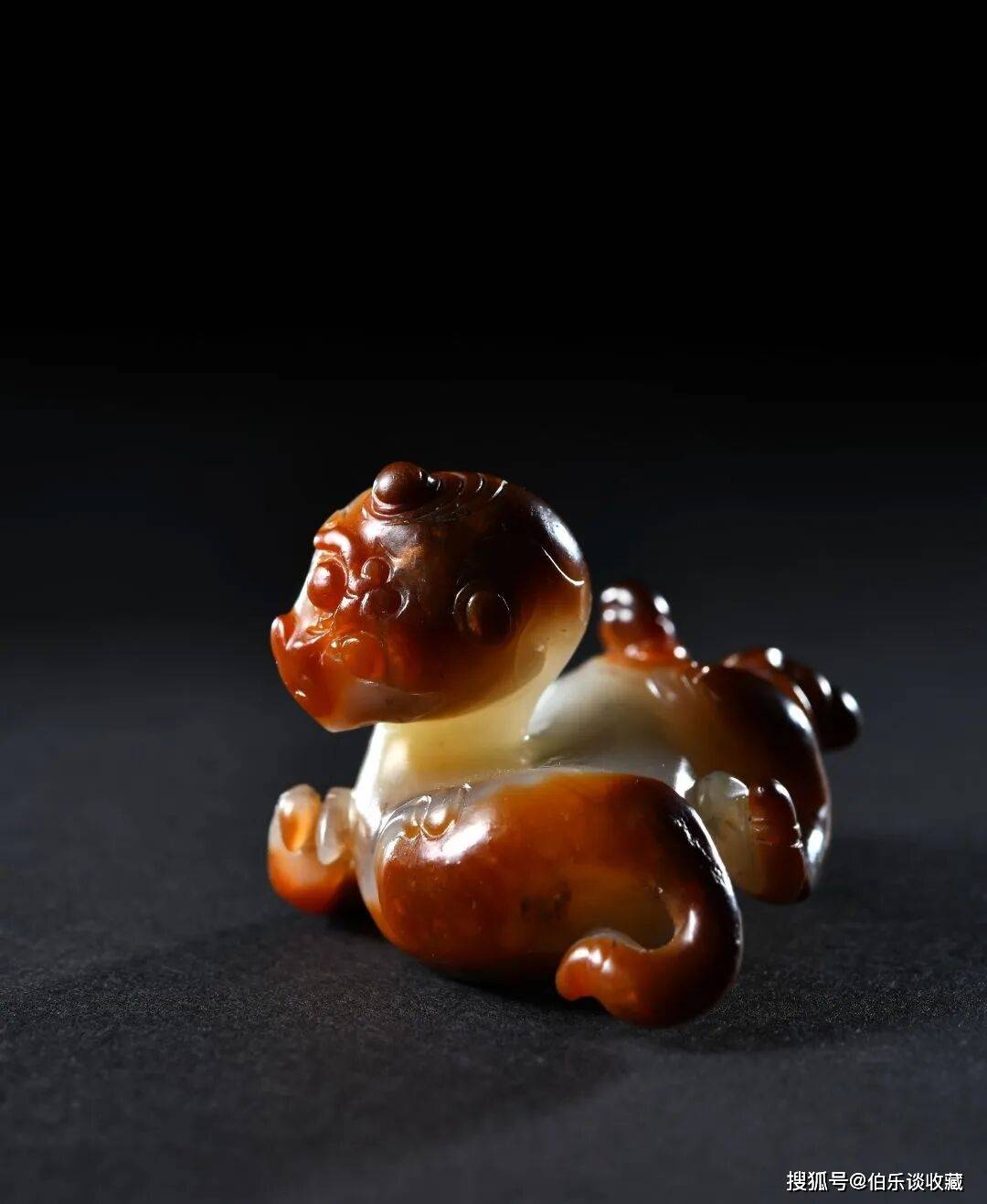 此件圆雕辟邪瑞兽取上等白玉琢制,玉质莹润细腻,局部受浓艳深沉的红沁,斑灿若霞染,古意盎然,宝光内蕴。瑞兽造型丰腴饱满,呈蹲伏侧首之姿,头部圆硕,目如卵石,獠牙微露,神情威猛中见憨稚,四肢粗壮有力,肌理饱满,趾爪分明。整体雕功细节处理精准。