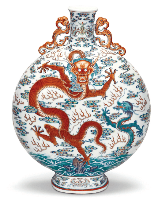 清乾隆 斗彩苍龙教子图夔龙耳抱月瓶