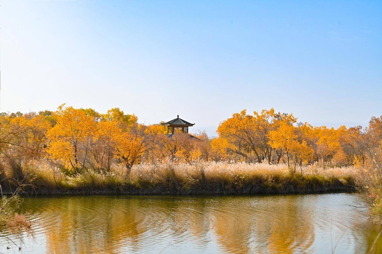 甘肃酒泉市金塔县胡杨林,西北地区一处独特的人工胡杨林景观。金塔胡杨林以其水天一色的金色秋景闻名,大部分是水生胡杨。核心位置金波湖,湖水与金色的胡杨林交相辉映,景色非常迷人。