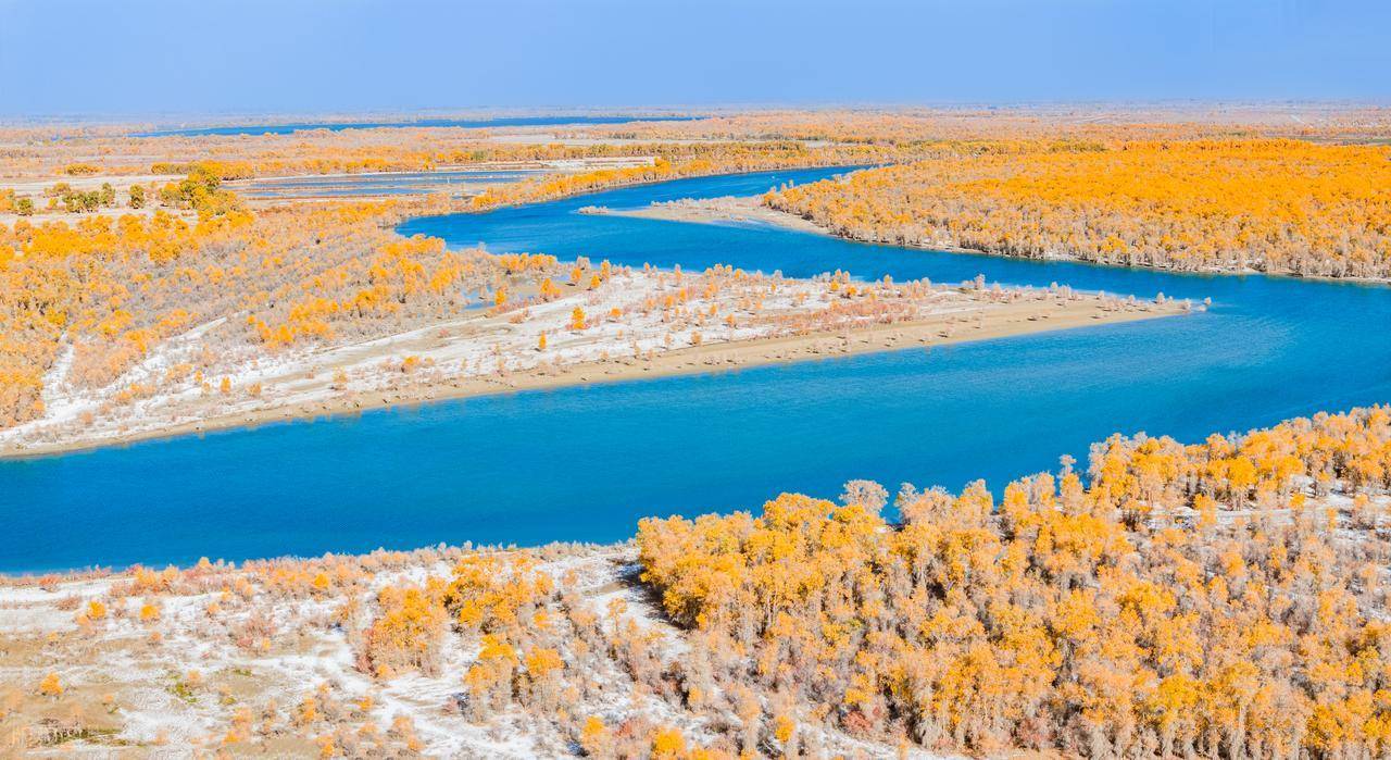 塔里木河沿岸的原始胡杨林,蜿蜒的塔河穿林而过,两岸泛着金波。集湿地胡杨、戈壁胡杨、沙漠胡杨、水胡杨于一体。