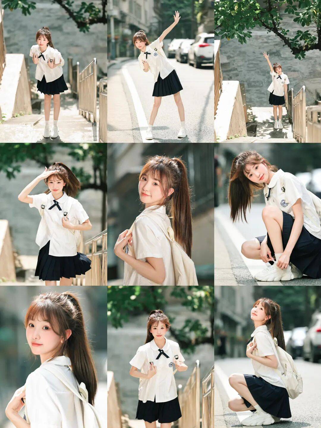 想拍一组充满青春感的校园风大片?看这组就够了!白衬衫百褶裙一穿,扎个高马尾,在老巷、楼梯、树荫下随意一摆,或俏皮挥手、或低头整理鞋带、或转身浅笑,把少女的灵动与校园的清新感全揉进画面里。拍照嘛,就是要这样把青春的模样定格得恰到好处~