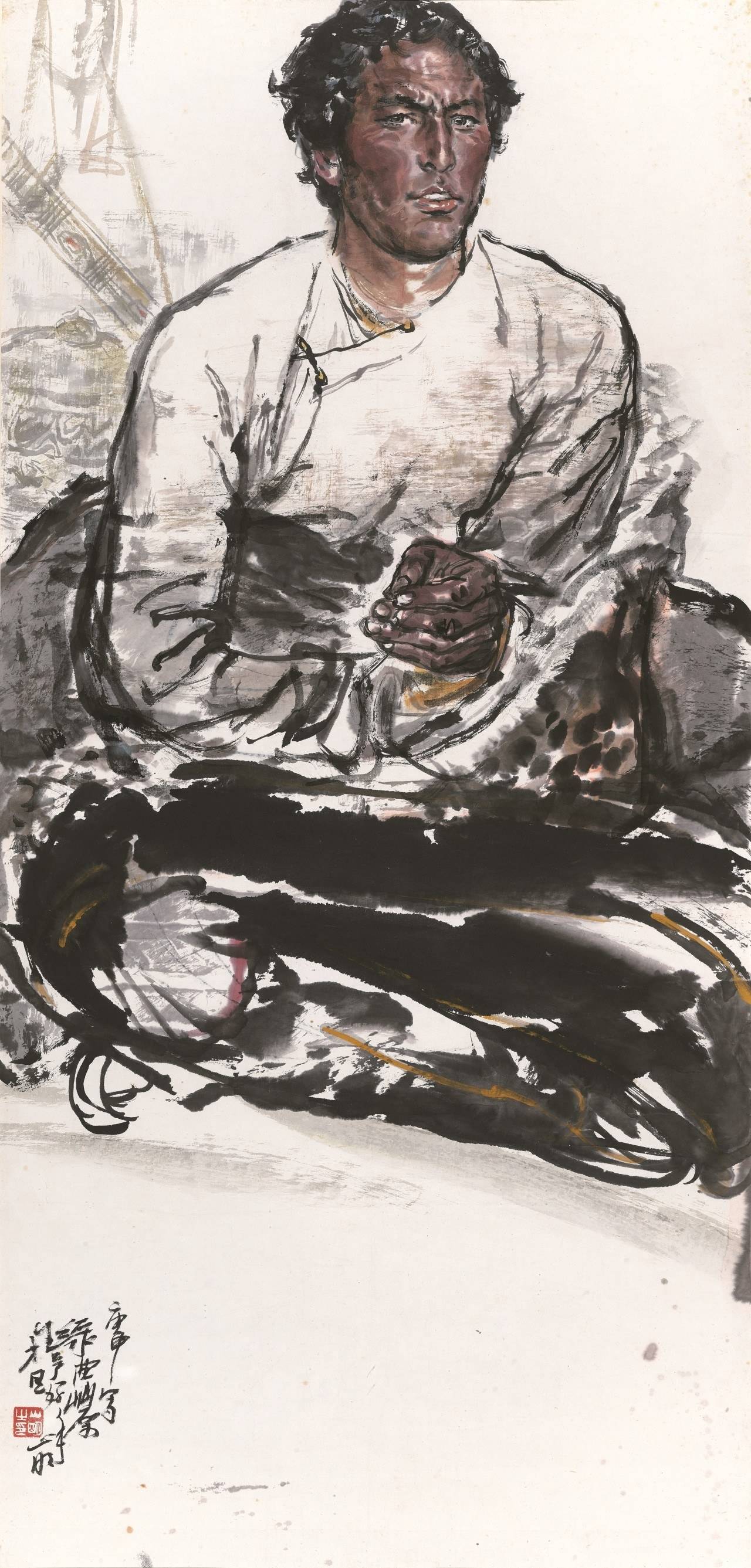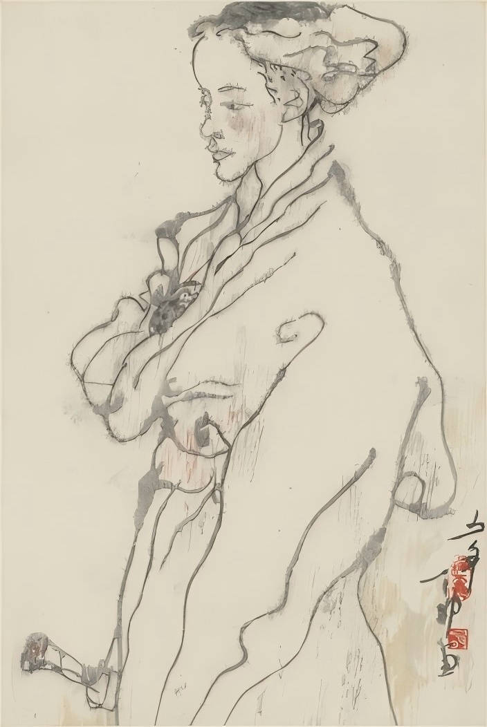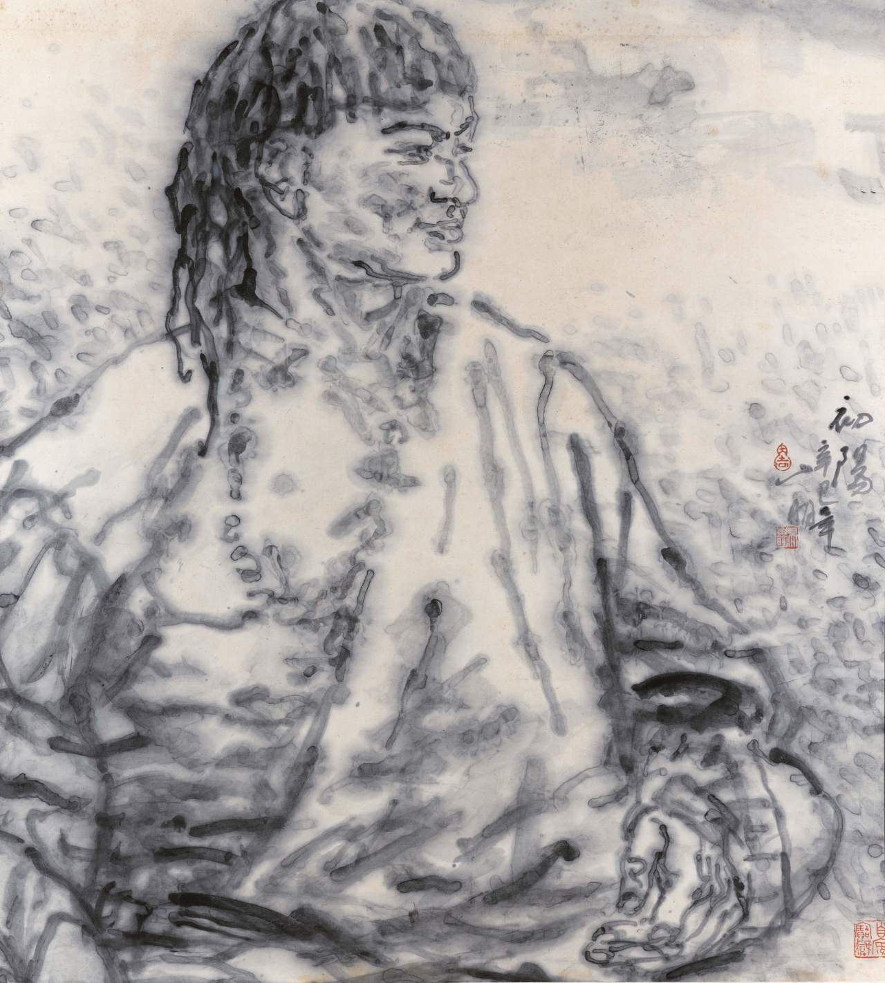 1986年,一个契机,使吴山明开始系统尝试宿墨的意笔线描。那年,他远赴青海写生,由于草原上条件艰苦,砚台宿夜未洗,他偶用宿墨画了一些作品,感到宿墨能很好地表现出青海藏区人民的粗粝和质朴。他仿佛被点醒,拨开迷雾看到了希望。回杭后他立即整理出第一批宿墨的意笔线描作品来。