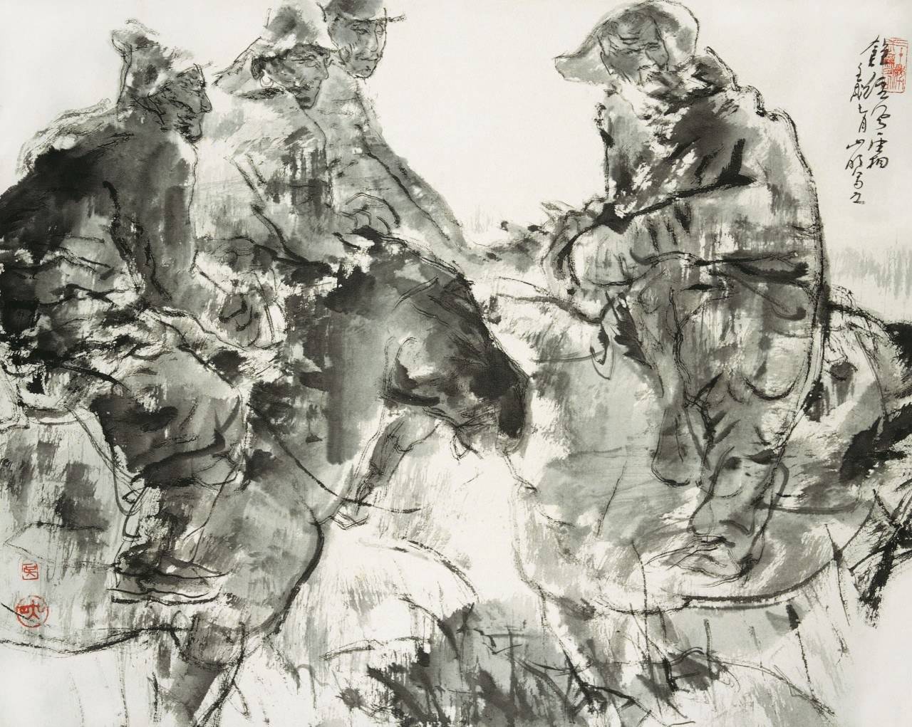 因此,他在教学中不但强调速写,还在外出写生时有意识地加强毛笔速写的训练。毛笔速写既是速写,也是国画创作。吴山明不仅将钢笔或铅笔速写进行水墨转化,还将现场画就的毛笔速写进行更深入的描写。毛笔速写的现场感和激情让他进入笔墨的实验之境。这一时期,他在没骨、泼墨、焦墨、意笔线描上同时发力,自由地运用各种笔法和线条。1982年的《饱经风霜》就是一幅速写性水墨作品,具有强烈的现场感。吴山明用枯笔勾勒出牧民们的身体结构,再用浓淡枯湿合宜的水墨渲染出气氛和人物的精神状态,一气呵成,十分生动。1985年的《雪山之鹰》同样融合宿墨枯笔与湿笔,运笔灵变,如入自由之境。