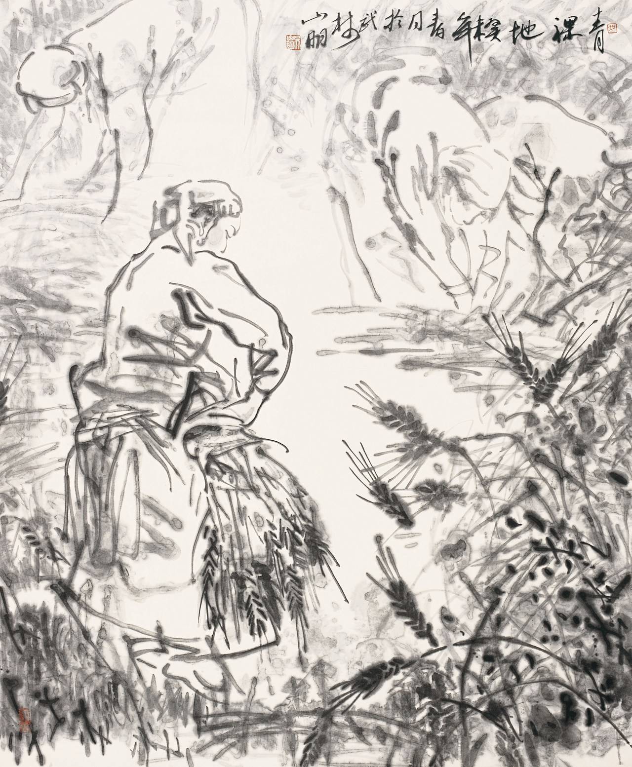 在吴山明早期的作品中,为了增强画面的现场感和生活感,他还是会表现一些光的影响,但这种手法仍然是在表现固定光源。让他真正意识到中国画笔墨本身的透亮性就可以表现光感的是黄宾虹先生。黄宾虹先生认为,白色的纸张使浓宿墨产生了透亮的感觉。吴山明本人第一次画出这种光感是在《阳光》这幅作品中。那是在草原上,“有个草原女孩,突然从很黑的帐篷里面出来,浑身处在光中,就像女神一样。我没用素描式的办法,而是用透亮的水带墨的笔痕来画,因此显出的光感是东方式的,是中国式的笔痕之间浓淡交错、晕化而形成的感受。这些笔痕存在于形体与画面的构建与层层交错之中,成为中国笔墨语言的一种新的审美方式”(第177页)。1995年创作的《备茶》也是如此。在2002年的《青稞地》中,吴山明再次论述了中国式的光感:“藏女在阳光下割青稞,我觉得应该可以用笔墨本身的这种透亮性来表现整片大地上的阳光,这种光感是中国式的。”(第189页)