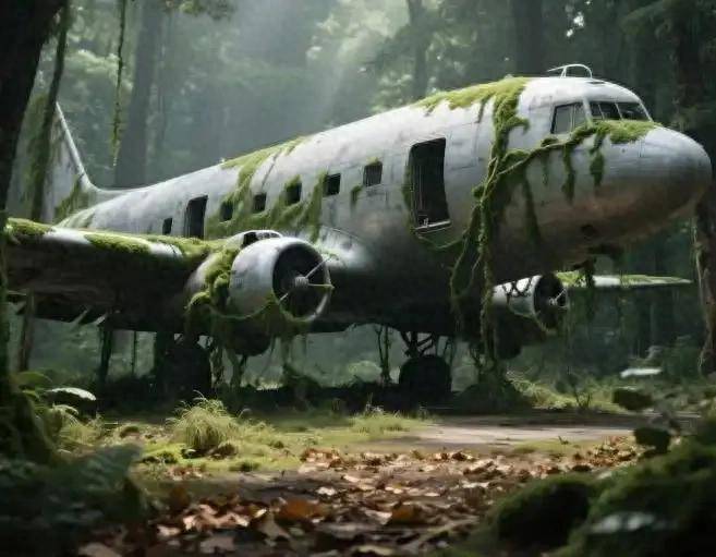 机身银灰色,表面有些风化的痕迹,爬满了苔藓和藤蔓,但整体结构完好无损,像是刚从军事基地开过来。