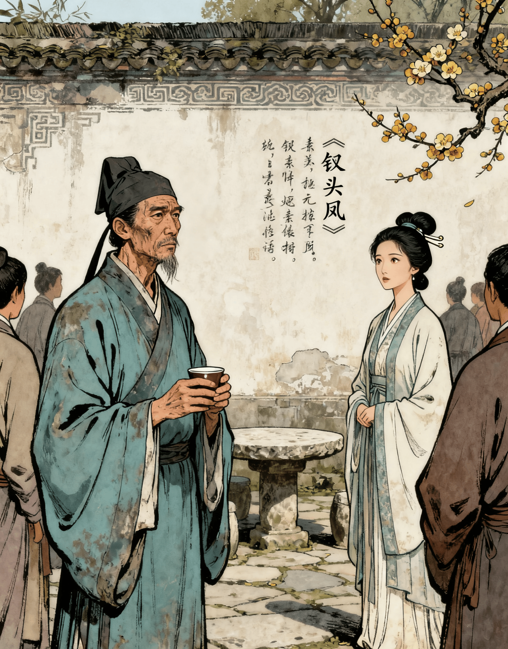 唐婉征得赵士程同意,命人送去一壶黄縢酒和几碟小菜。陆游“两行热泪凄然而下,一扬头喝下了这杯苦酒”。这杯酒,是前妻的深情,是故人的问候,更是命运的嘲弄。悲痛难抑的他,在粉墙上题下《钗头凤·红酥手》:“错!错!错!”——错在软弱,错在无奈,错在生不逢时。