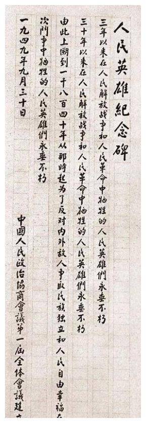关于碑面题字,建筑大师林徽因建议由毛主席亲笔题写。1955年6月9日,毛主席挥毫写下人民英雄永垂不朽八个大字。其余碑文则由周恩来总理负责书写。虽然当时周总理正在北戴河养病,但他仍以高度负责的态度,将百余字的碑文反复书写四十余遍,直到满意为止。