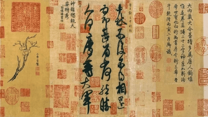 所以,如果有人模仿,很有可能米芾!估计乾隆看出来了,也舍不得丢掉了吧?所以,就被各种题跋——明董其昌、项元汴,清乾隆题跋,而且,乾隆、丁观鹏还各自绘画一段。卷前后及隔水钤有宋“宣和”内府➡南宋内府➡明项元汴➡吴廷➡清内府"等鉴藏印。