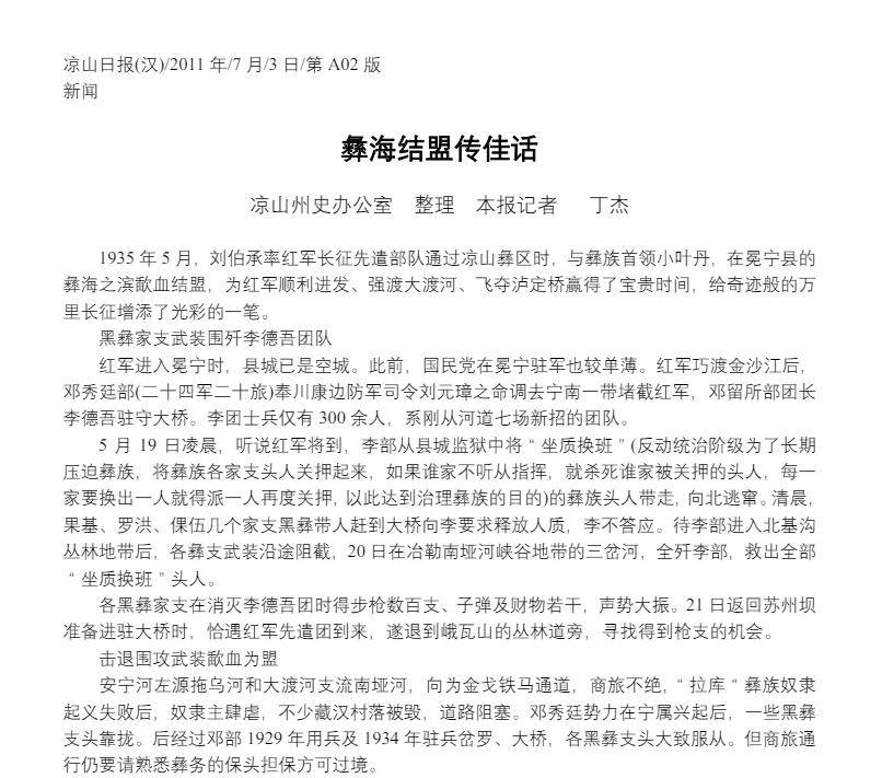 1935年春末夏初,红军长征进入了四川西南部的彝族聚居区——凉山。那时,刘伯承将军带领的红军先遣队穿越了崎岖的山区,来到这片历史悠久的彝族地区。