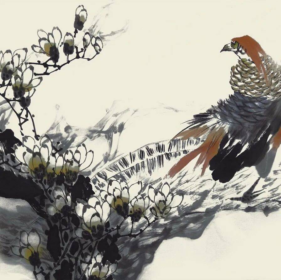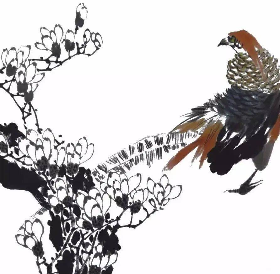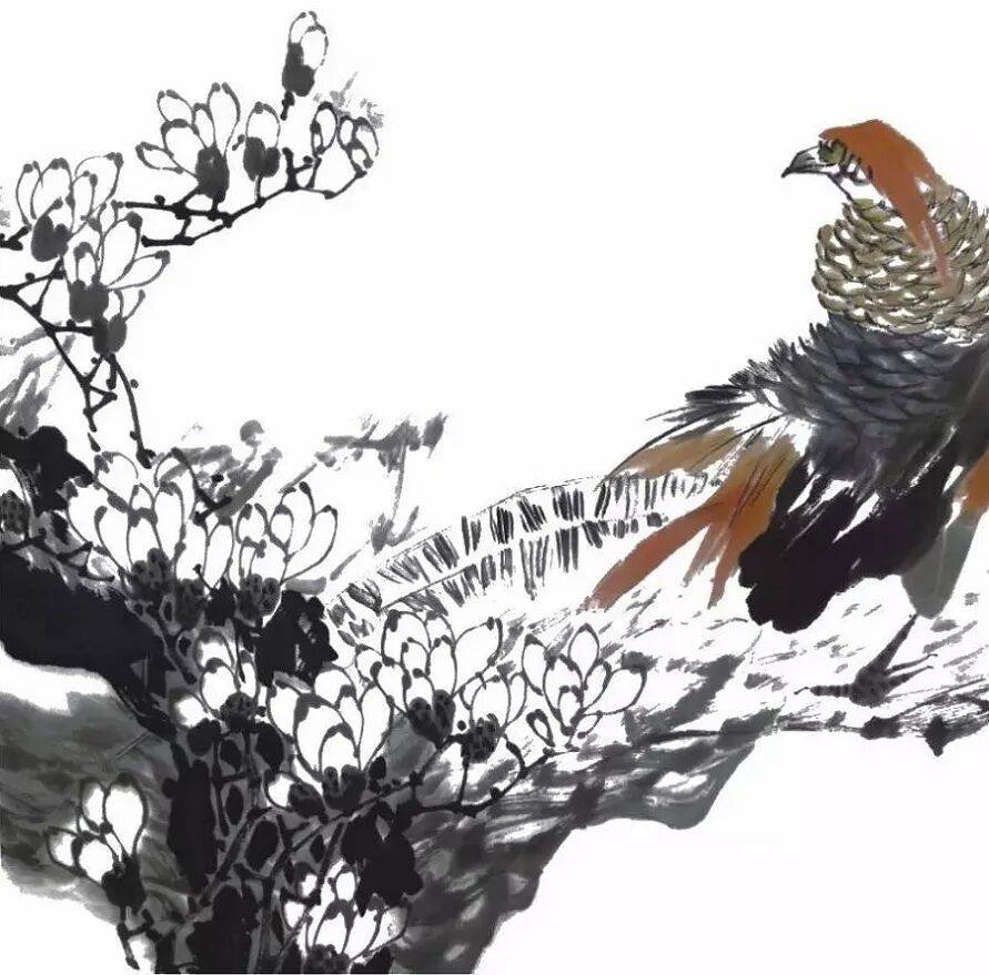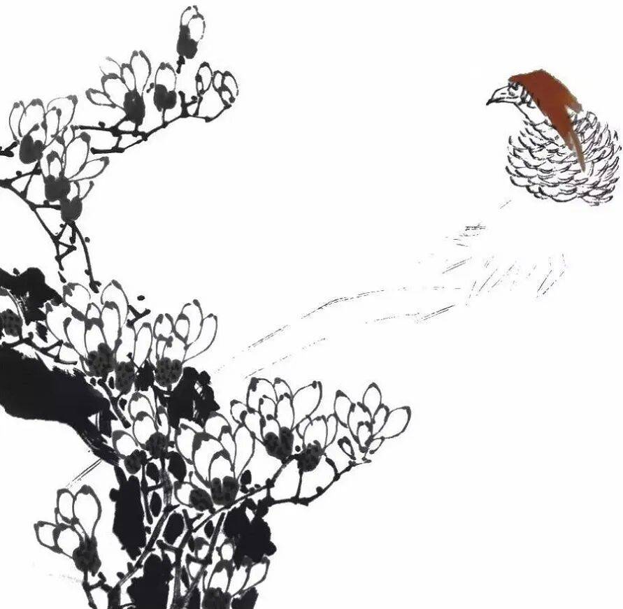 第一步:用较淡的墨色细线勾勒玉兰的花瓣,用浓墨粗犷的笔法画后面的树干。