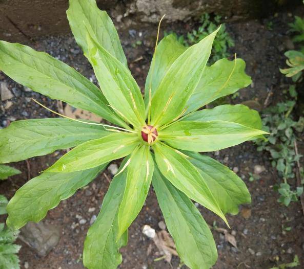 七叶一枝花长得非常简单,就是一根绿色的茎,然后7片叶子长在茎顶,中间可能还会伸出一根花梗,挑着一朵黄绿小花,就这样了;4月份开始就会开花,到了8月份还会结出红色至紫黑色的浆果,像是小石榴。