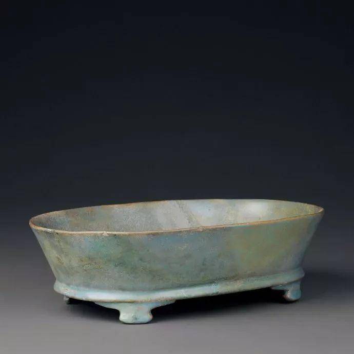 品名:北宋汝窑青瓷水仙盆尺寸:高6.1cm 深3.8cm 口纵15.8cm 口横23.1cm 底纵13cm 底横19.5cm典藏号:故瓷017699原收藏地:养心殿底部支钉:5枚传记:椭圆形盆、侈口、深壁、平底、底足间突出一圈窄边稜、四足、足呈云头形。1936年曾参加伦敦中国艺术国际展览会,编号Porcelain No.26。全器满釉不露胎,仅在器底留下五个支钉痕。目前传世汝窑水仙盆共有五件,一件藏于日本大阪市立东洋陶瓷馆,其他四件都在台北故宫博物院。五件水仙盆中,只有这一件以五支钉,其他四件都是六个支钉烧成。台北故宫馆藏21件汝窑完整介绍之二十汝窑青瓷盘▼