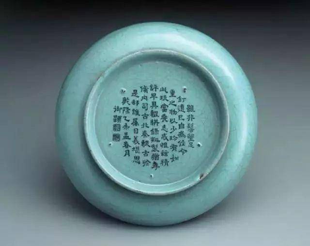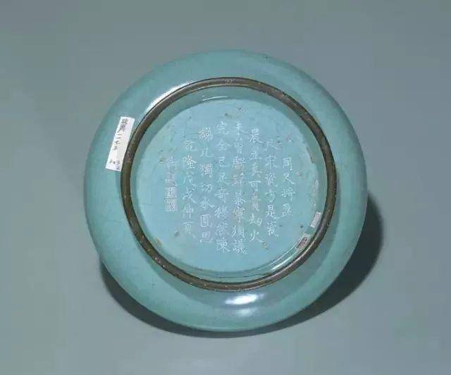 品名:北宋汝窑青瓷盘尺寸:高3.8cm 深2.3cm 口径18.4cm 足径12.7cm典藏号:故瓷013962原收藏地:永寿宫底部支钉:5枚传记:敛圆口、浅壁、壁呈弧形、平底、圈足略高且外撇。底部有五支钉痕,并刻有乾隆乙未年(1775)孟春月,也就是乾隆四十年正月御题一首。御制诗:虽非髻垦足钉遗,已自为佳今重之,物以少珍有如此,玩当丧志戒惟兹,精评早具辍耕录,剏制猶存修内司,古北秦甎古于是,却谁属目義堪思。台北故宫馆藏21件汝窑完整介绍之二十一汝窑青瓷“奉华”碟▼