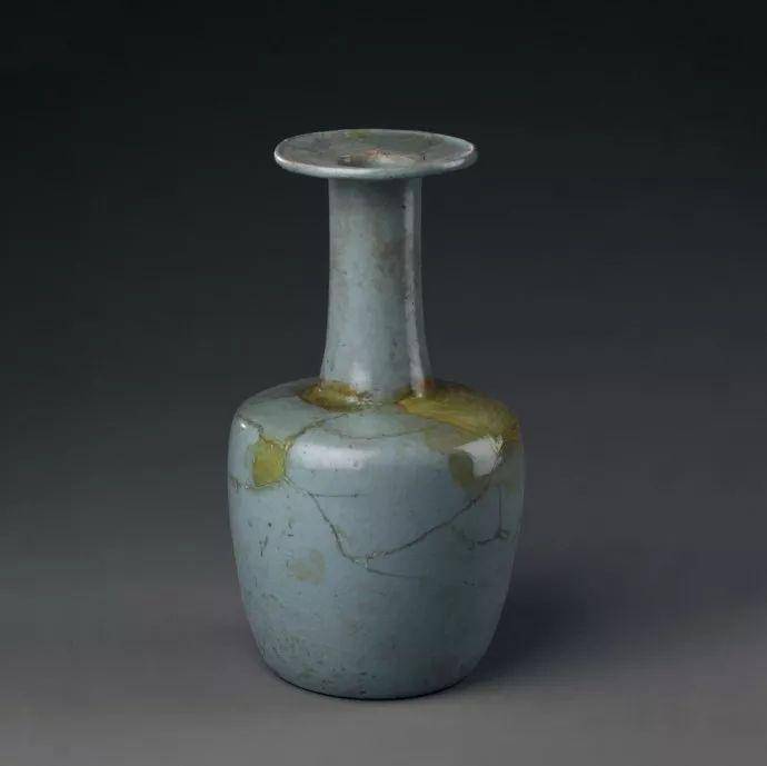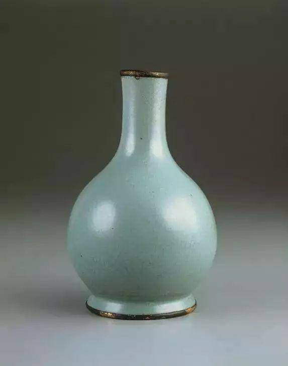 品名:北宋汝窑青瓷胆瓶尺寸:高17.9cm 深16.6cm 口径3.2cm 足径8.9cm典藏号:故瓷004372原收藏地:慈宁花园底部支钉:0枚传记:圆口、直颈,圆球型腹、平底、矮圈足、足向外撇。口沿及足沿皆镶有鎏金铜釦。底心去除一圈釉,并塗有褐色汁液,中心露出土黄胎色,可能是致垫痕迹造成。底部有釉底地方,则刻有乾隆乙末年(1775)御题一首。诗中提到这件胆瓶“通体纯清细纹”,观察本器可以看到布满细碎纹片,主纹呈现右下左上走向。河南宝丰清凉寺汝窑遗址曾出土一件天青釉撇口瓶,器型与本件相似但颈部较长,因此推测本件可能在清代时即因口部有伤而磨平并镶铜釦。台北故宫馆藏21件汝窑完整介绍之七汝窑青瓷圆洗▼