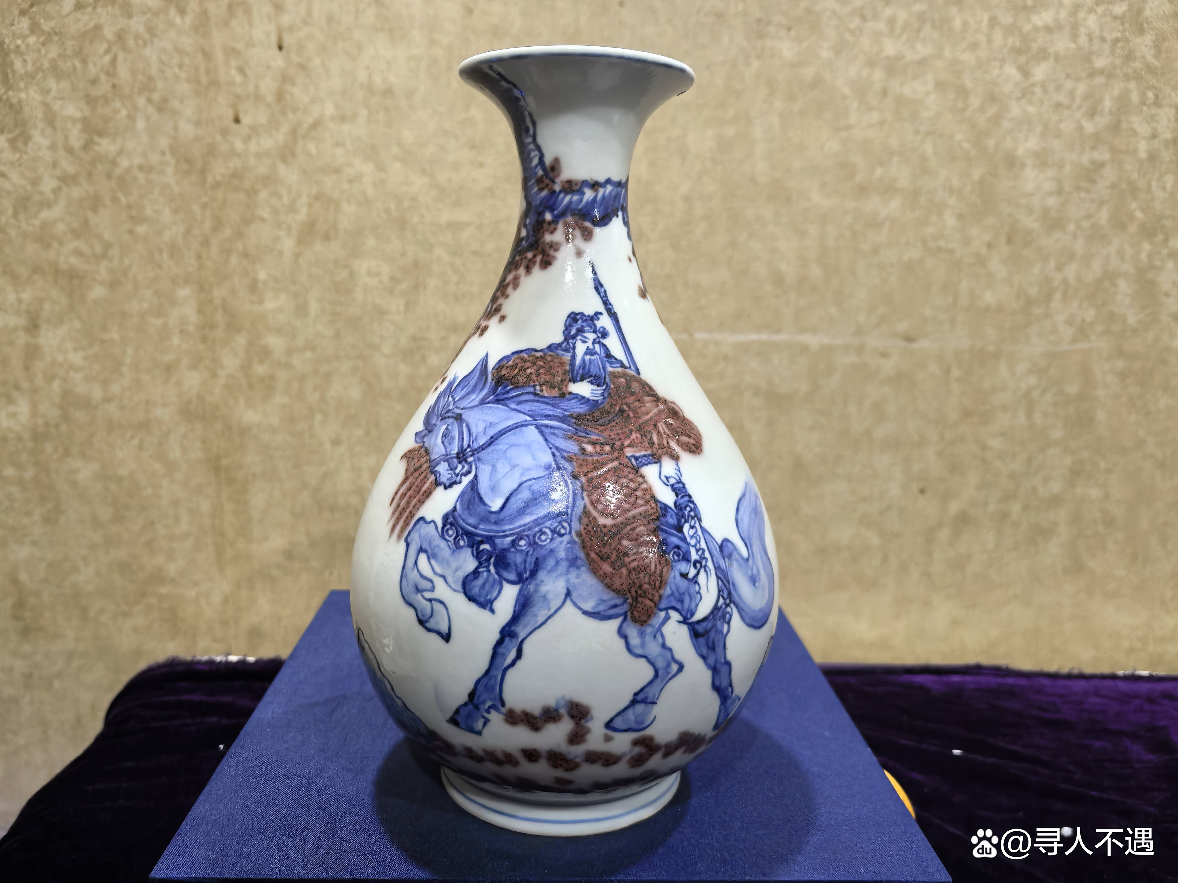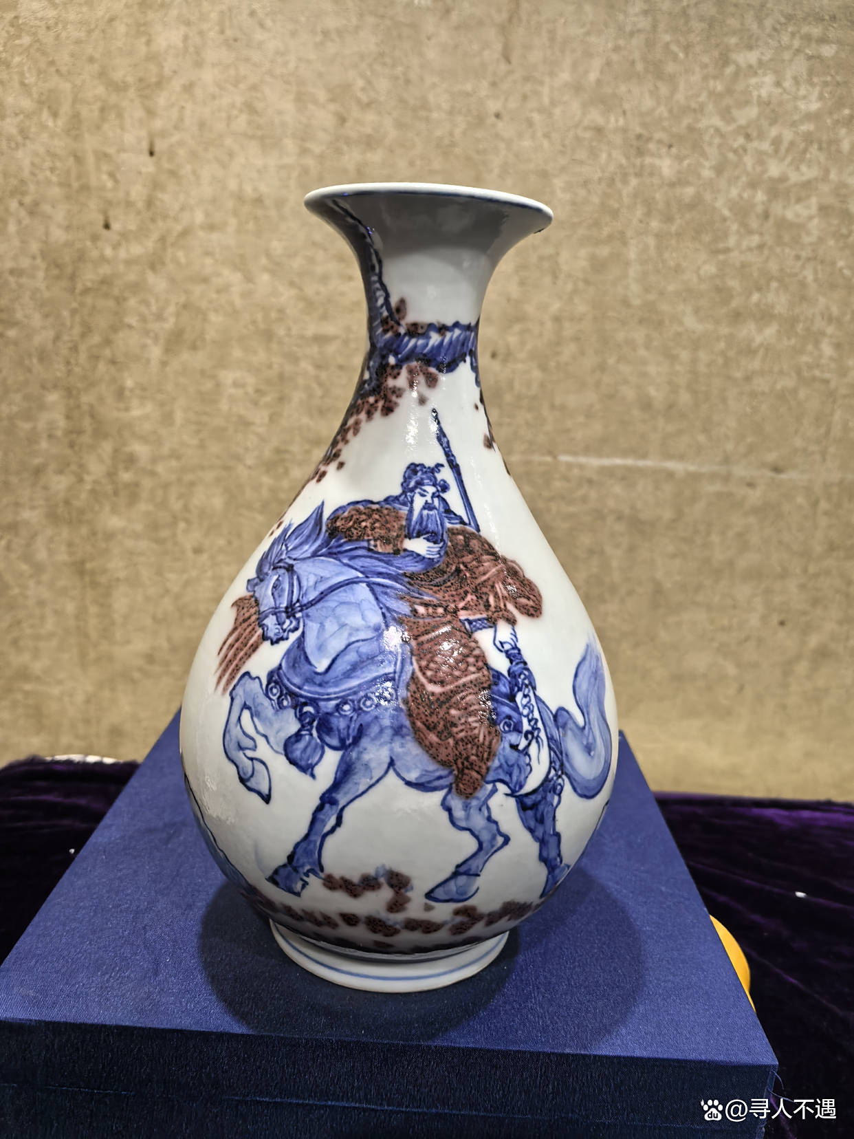 在幽暗的藏室中,它静立如一位身披战甲的诗人。白釉为纸,青花作墨,釉里红似点点凝血,瓶身上奔腾的骏马仿佛要破壁而出。当目光掠过颈部那首用青花书写的《雁门太守行》,耳边似乎响起五百年前景德镇窑火的轰鸣。这不仅仅是一件瓷器,更是一段被封印的史诗——大明宣德朝的赫赫武功与文人风流,在此刻完美交融。