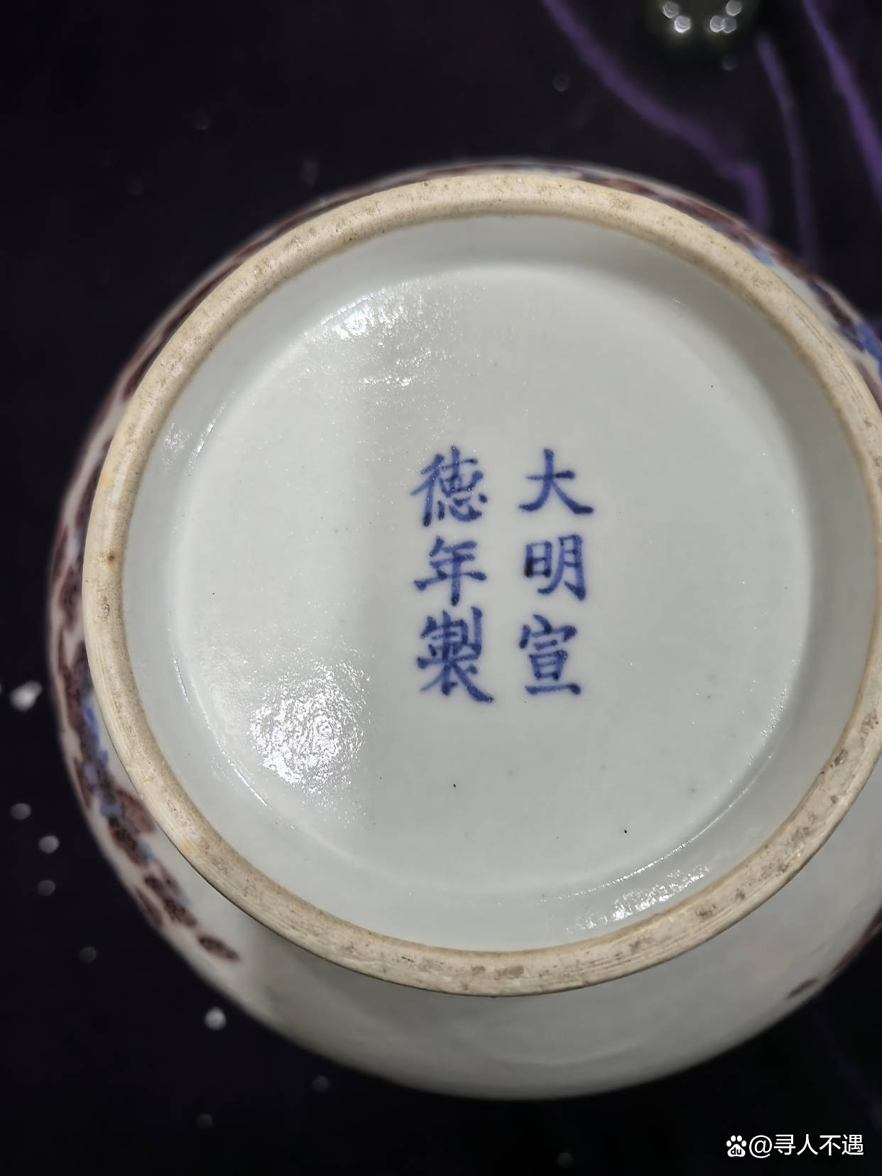颈部的釉里红折枝梅,五朵花苞暗合"五瓣宪章"。宣德皇帝曾用梅花比喻言官风骨,而梅枝的"弓形"构图,实为模仿永乐帝的"永乐弓"。最精妙的是花蕊用青花点蕊,形成"青花点苔"的特殊工艺,此种技法仅见于宣德早期御窑。