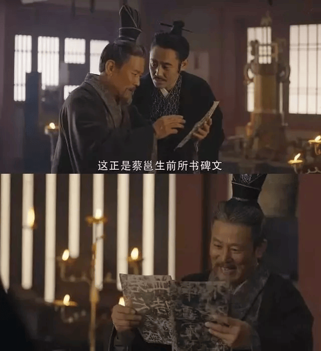 该剧中还展示了一人物的不凡书法,即蔡邕(yōng)。不论是《曹娥碑》猜字谜,还是司马防忍痛割爱,取出宝贵的蔡邕碑文,让司马懿赠送给钟繇。我们来看看钟繇得到蔡邕碑文欣喜的表情就知道了。