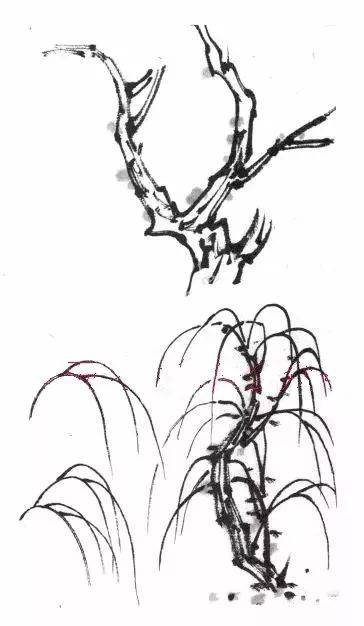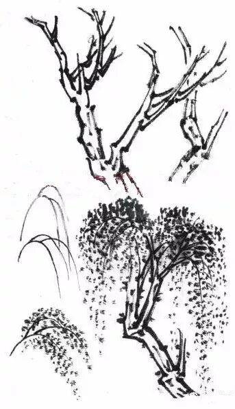 ,画时先画主干,再分嫩枝,以鹊爪形画之,随嫩枝画叶似燕飞。↓↓↓
