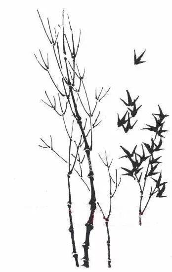 ,画时,首先画主竿,再画嫩枝,随枝画个字形叶子,但要求有层次而不乱。↓↓↓