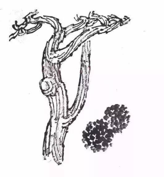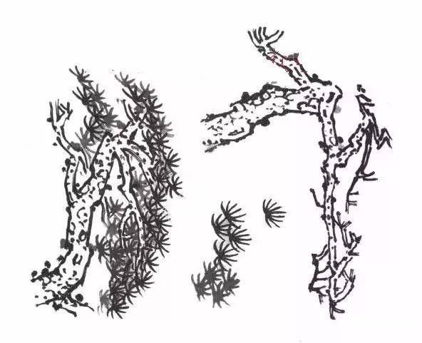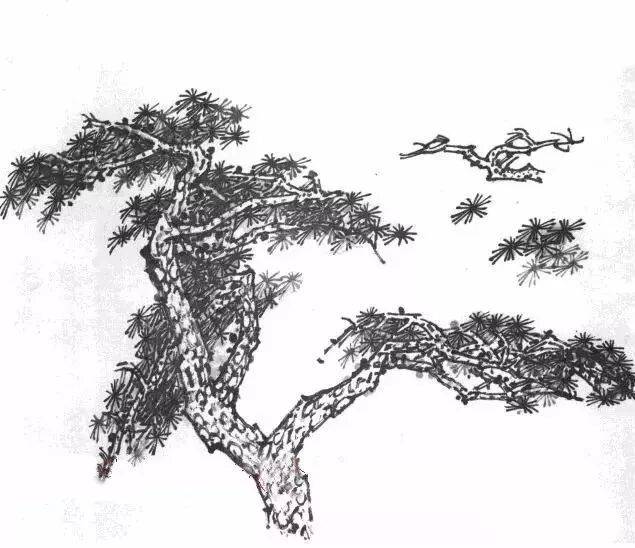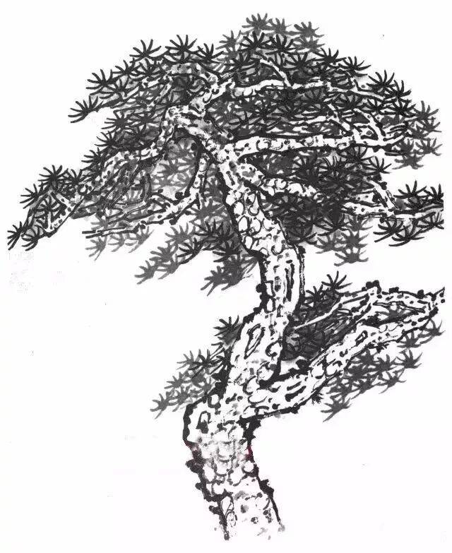,特点是树干多弯曲,姿态如龙,叶如浮云凌空。画时应先勾树干的轮廓,边勾边画树皮的鳞纹状。树干应四面生枝穿插自然,左右顾盼,前后俯仰,有争有让、有疏有密。用笔时中、侧锋兼顾,达到苍劲有力。松叶的特点细长如针状,有坚硬感,用笔多中锋,其松叶整体层次形状如云,切忌平板。↓↓↓