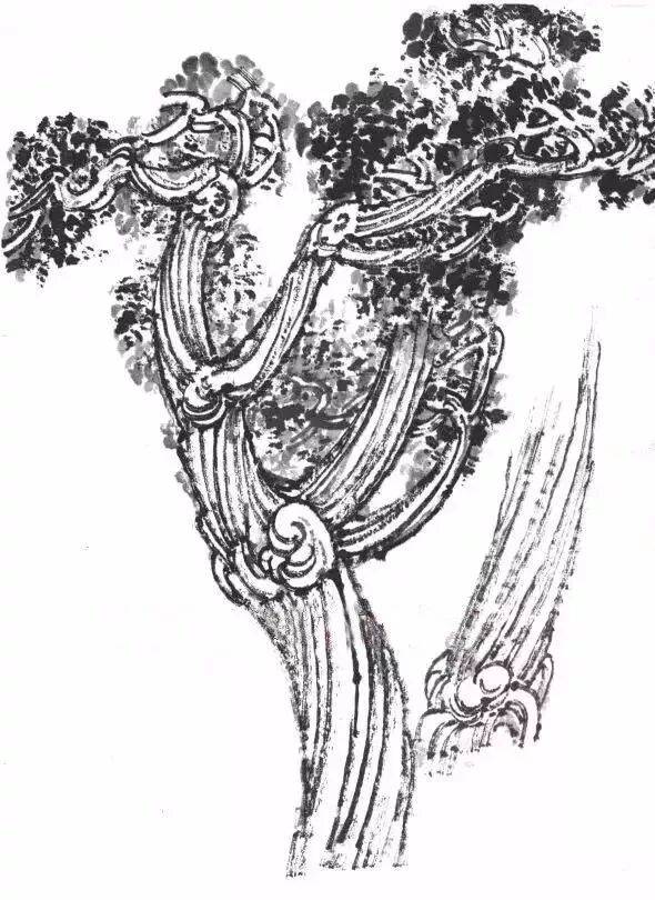,柏树的姿态特点是:树干弯、转、拧、绞,树的根部和枝干的分岔之处多有节疤,有凸有凹。树皮的纹理呈绳纹状,苍老中见光滑。画时应用中锋长线,干湿笔结合,边勾主干,边加枝干;边勾绳纹的树皮和节疤。线条要流畅,有疏有密,有虚有实,勾后随着着线条适当加以皴擦,达到苍润之感。