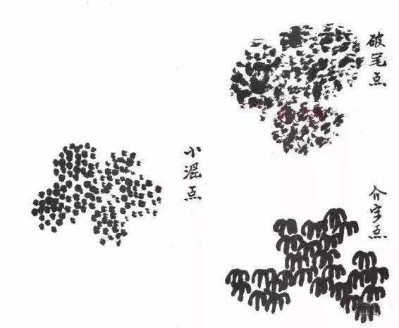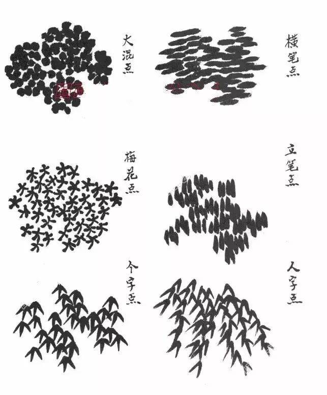 1.小混点,2.大混点,3.横笔点,4.破笔点,5.梅花点,6.立笔点,7.介字点,8.个字点,9.人字点。无论哪种点法,都要根据苔的形状进行不同笔法点之。苔有正、侧之分,用笔就应有顿、揉、挫之分,用笔有快有慢,但都应有劲有力,达到墨气润厚,形状统一,切忌乱、浮。↓↓↓