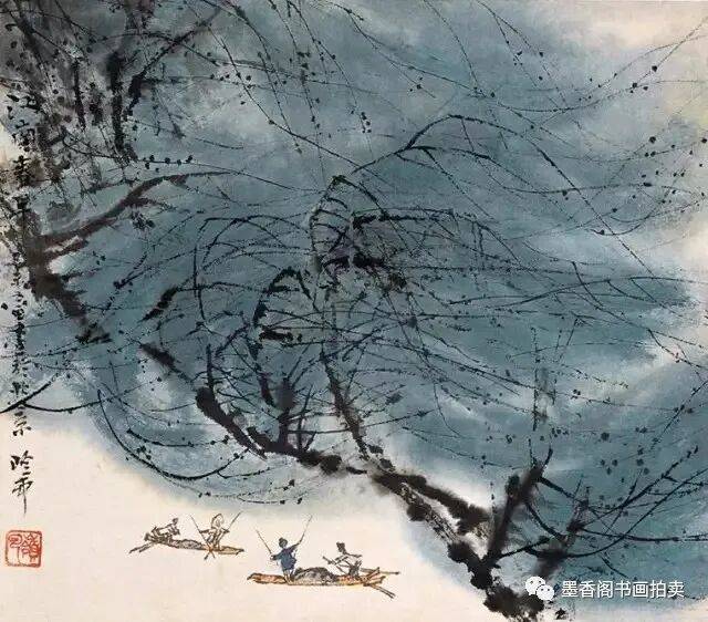 俗称画树难画柳。画春柳首先要以中锋侧锋并用画老干,然后用中锋画柳枝和柳条。要将老干画的粗壮苍厚,柳条画的柔中见刚。柳条以三笔或四笔一组,由顶端向下垂的方向画出,应有长有短,有疏有密,切忌杂乱。最后随着柳条的疏密点以深、浅墨色的混点,达到穿插自如,静中有动之感。↓↓↓