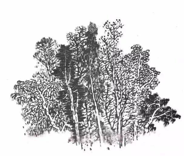 各种树木生长在一起叫丛林,也可叫杂树。在画这种树的时候,首先要考虑各种树木的主次关系、长势特点、前后层次、粗细大小、虚实变化、叶子形状等等。在用笔用墨时应充分发挥各种勾、点、皴等笔法,和深、浅、浓、淡、干、湿的墨法作用。在画树干时,应有断有续、有藏有露、有粗有细、有主有次。用笔有双勾和草勾交错运用,要做到杂而不乱,达到层次浑厚的效果。杂树叶也可用大混点、小混点、破笔点、乱笔点、立笔点、横笔点、个字点、介字点等点法。用不同的点来表现丛林茂盛的效果,以达到密中有透、疏而不露、杂而不乱,既统一又多变化,切忌薄、乱、散。↓↓↓