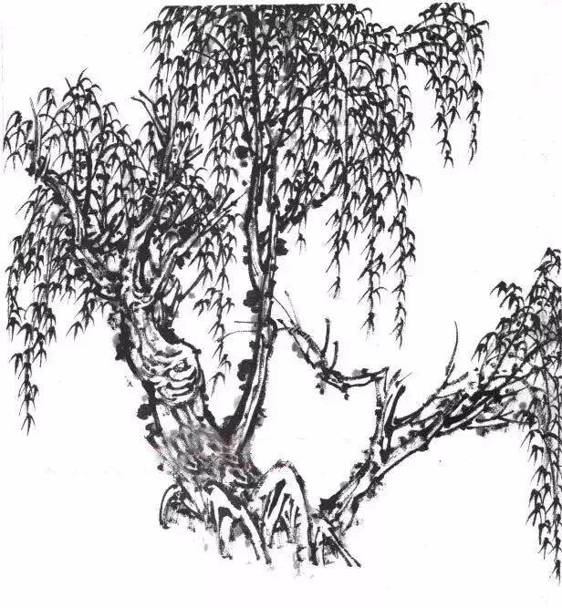 ,特点是树干向上长而枝条向下垂。画柳树时要求树皮要画得苍老粗糙,柳条要画的柔软洒脱,轻松纤细,疏密得当,密而不乱。