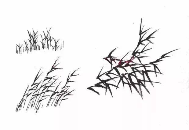 画成片的芦草,是以表现草叶为主,画时应注意疏密穿插。可用个字点、人字点、介字点的方法画出,注意整体效果,切忌杂乱无章。↓↓↓
