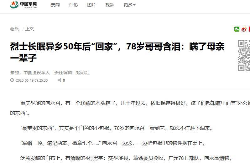 几十年来,向永召不断寻找弟弟的埋骨之地,奔波于多个地方和部门,但始终没有结果。直到2019年,向永召突然收到一个消息,原来弟弟向永高长眠在四川广元市的烈士陵园。半个世纪的等待,终于找到了弟弟的归宿。