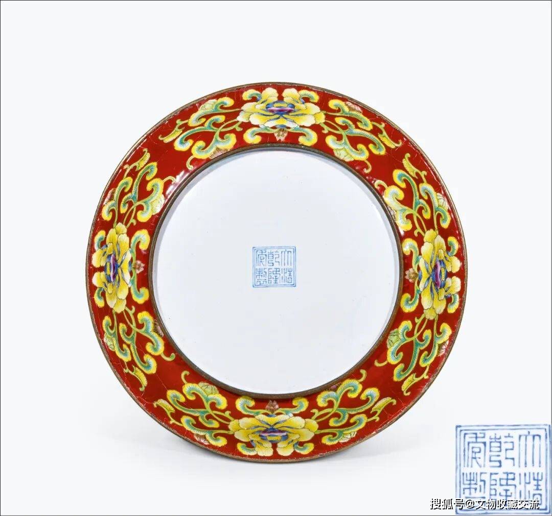 铜胎胭脂红地画珐琅牡丹纹盘