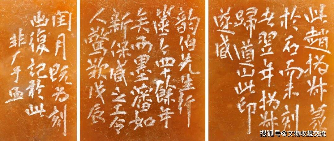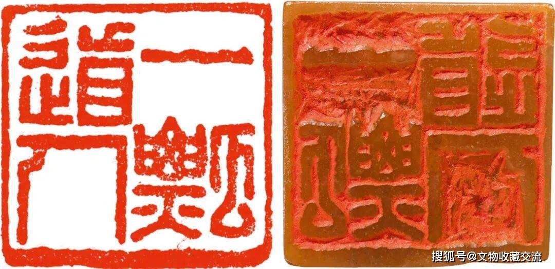 边款:“此赵撝叔篆于石而未刻者,翌年撝叔归道山,此印遂藏。韵伯先生行,箧今四十余年矣,而墨沈如新,保藏之工令人惊欸。戊辰(1928年)闰月既为刻出复记于此。非厂于照”、印文“一瓢道人”