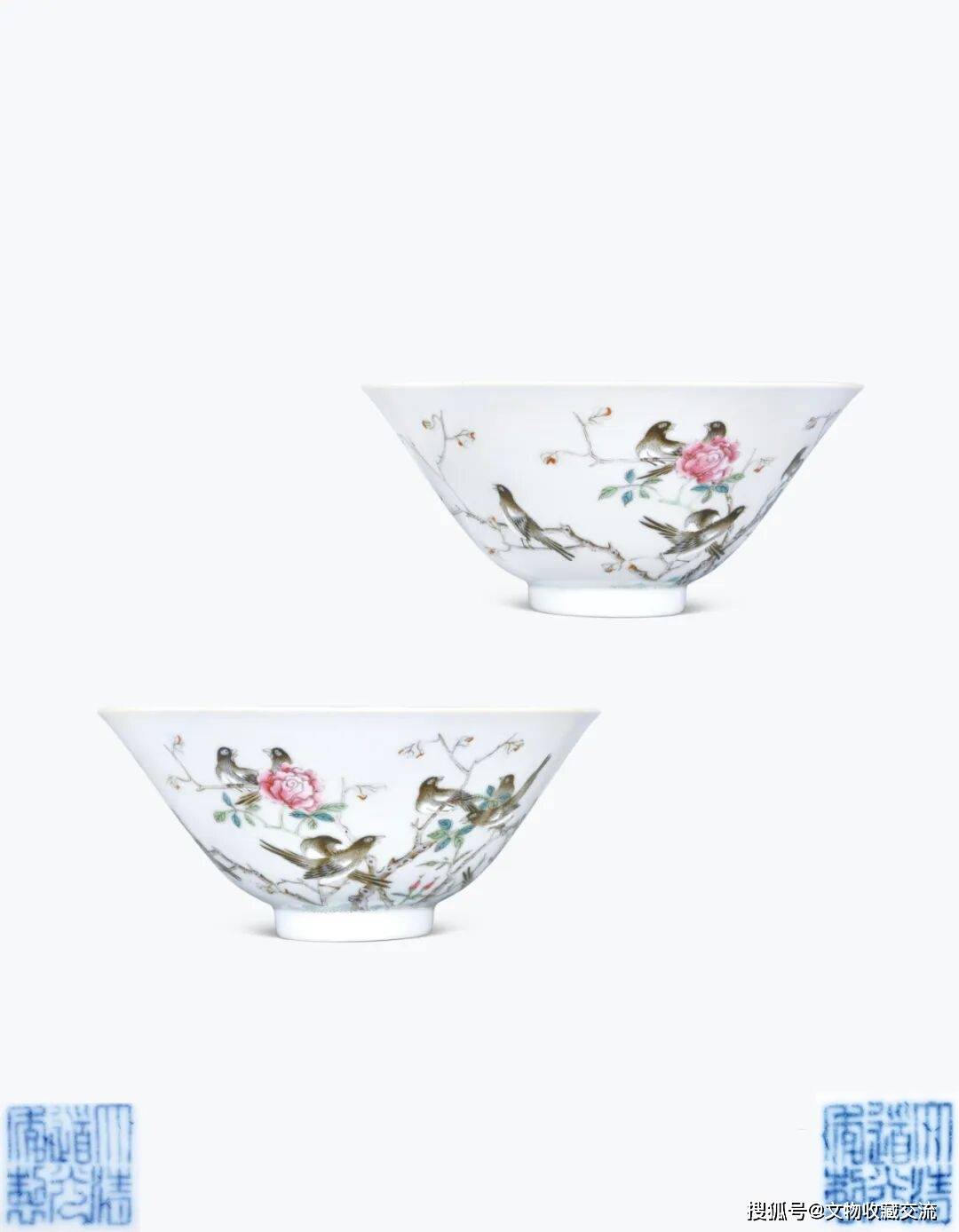值得关注的是,本品则是以喜鹊和月季绘画相组合出现,取月季中的“月”字与喜鹊之“喜”字,组成“月月见喜”之吉祥寓意,这在道光官窑装饰中则极为少见。此外,从本品器型不难看出,其与道光官窑中所流行一类粉彩三羊开泰诗文碗造型一致,均呈斗笠式。如中国嘉德2025年春拍所释出一对清道光粉彩三阳开泰诗文斗笠碗,成交价高达80.5万元,可资比较。